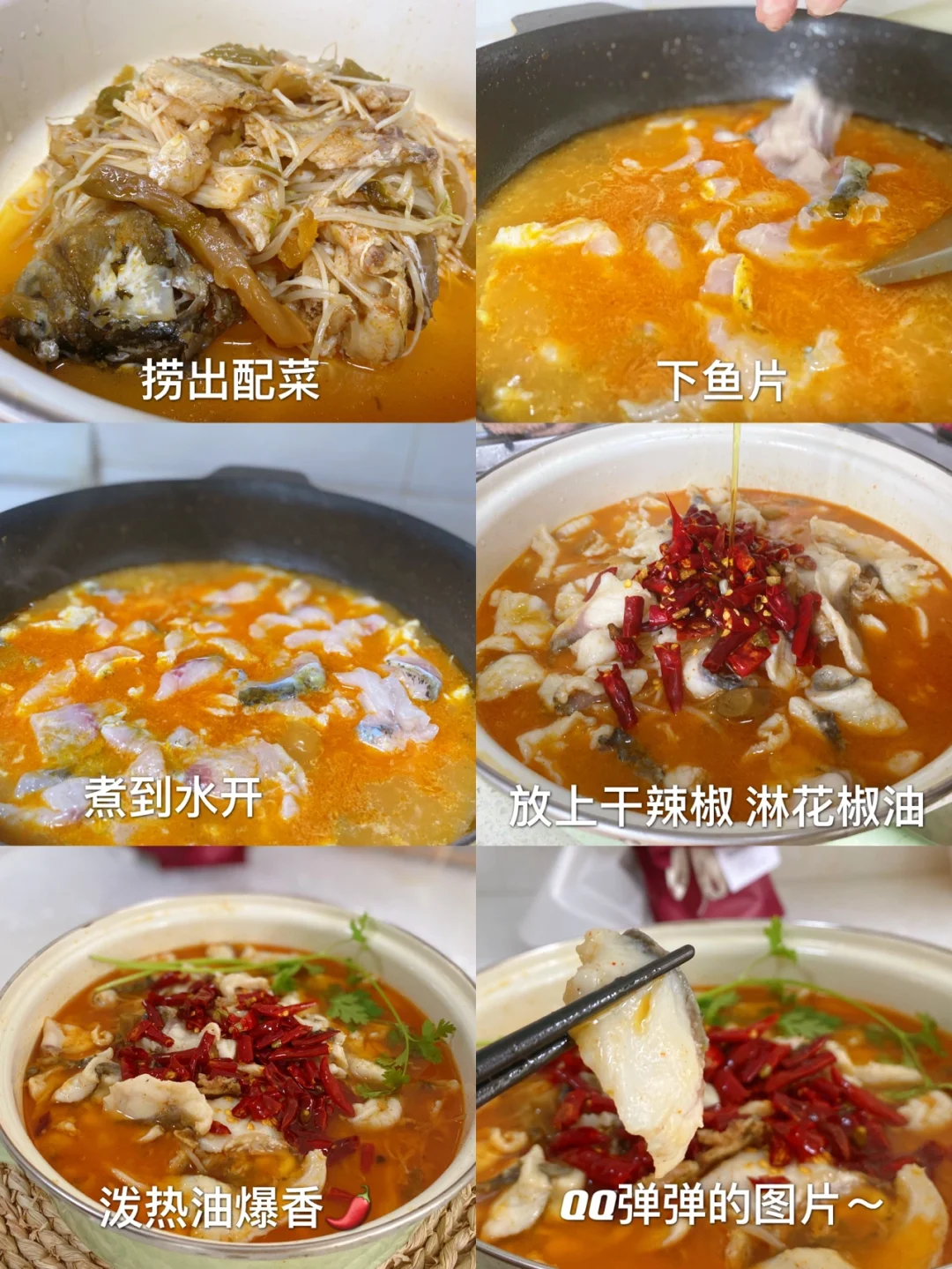 6⃣️:鱼片上放上干辣椒,淋一点花椒油(可用花椒粒)