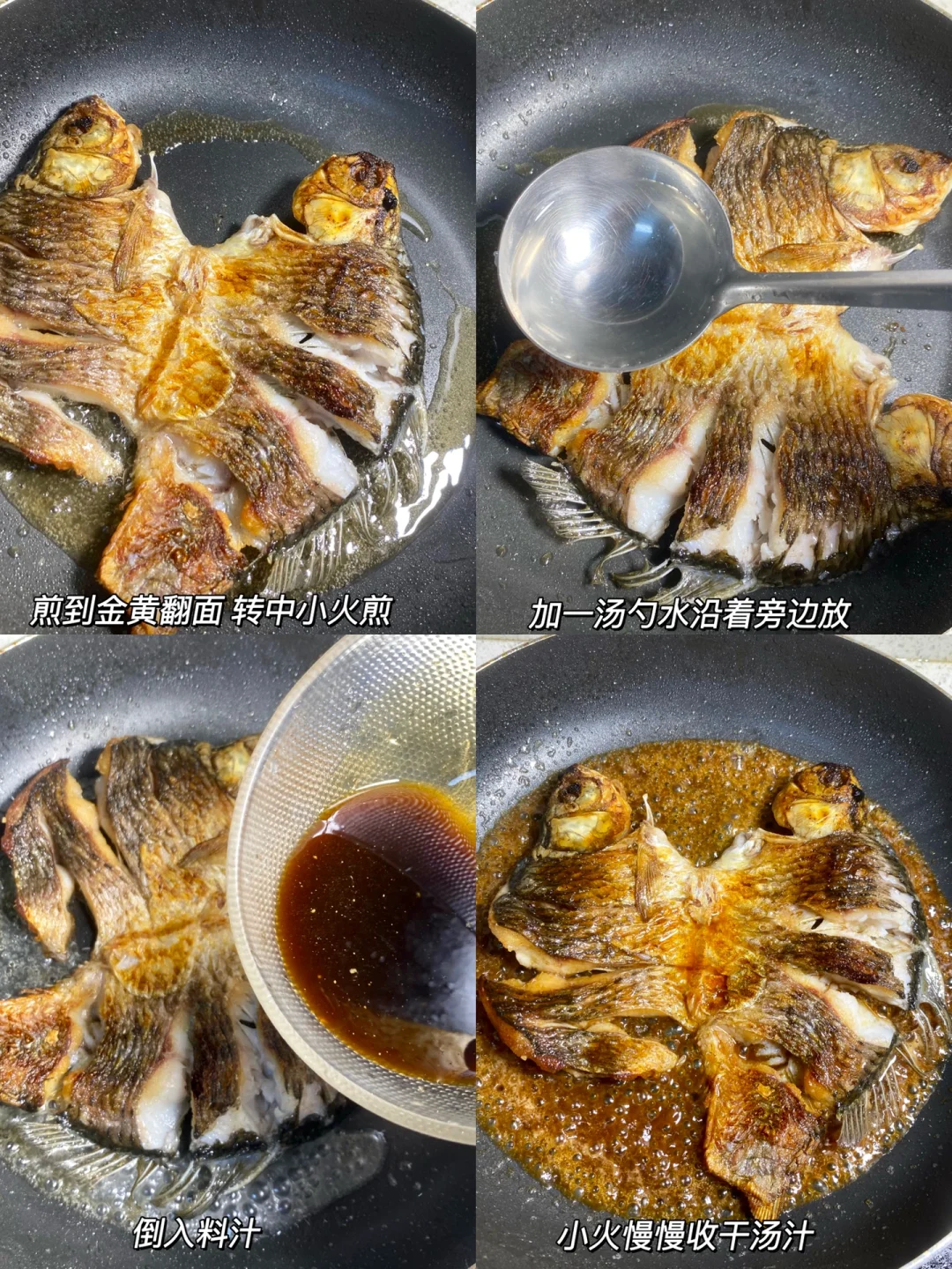 3⃣️:鱼拿出来把葱姜挑干净,用厨房纸擦干水分,不粘锅里倒油烧热后鱼皮擦下大火煎三分钟 (可以用锅铲把鱼压住煎)看到底部变色变脆就可以快速翻面转中小火煎