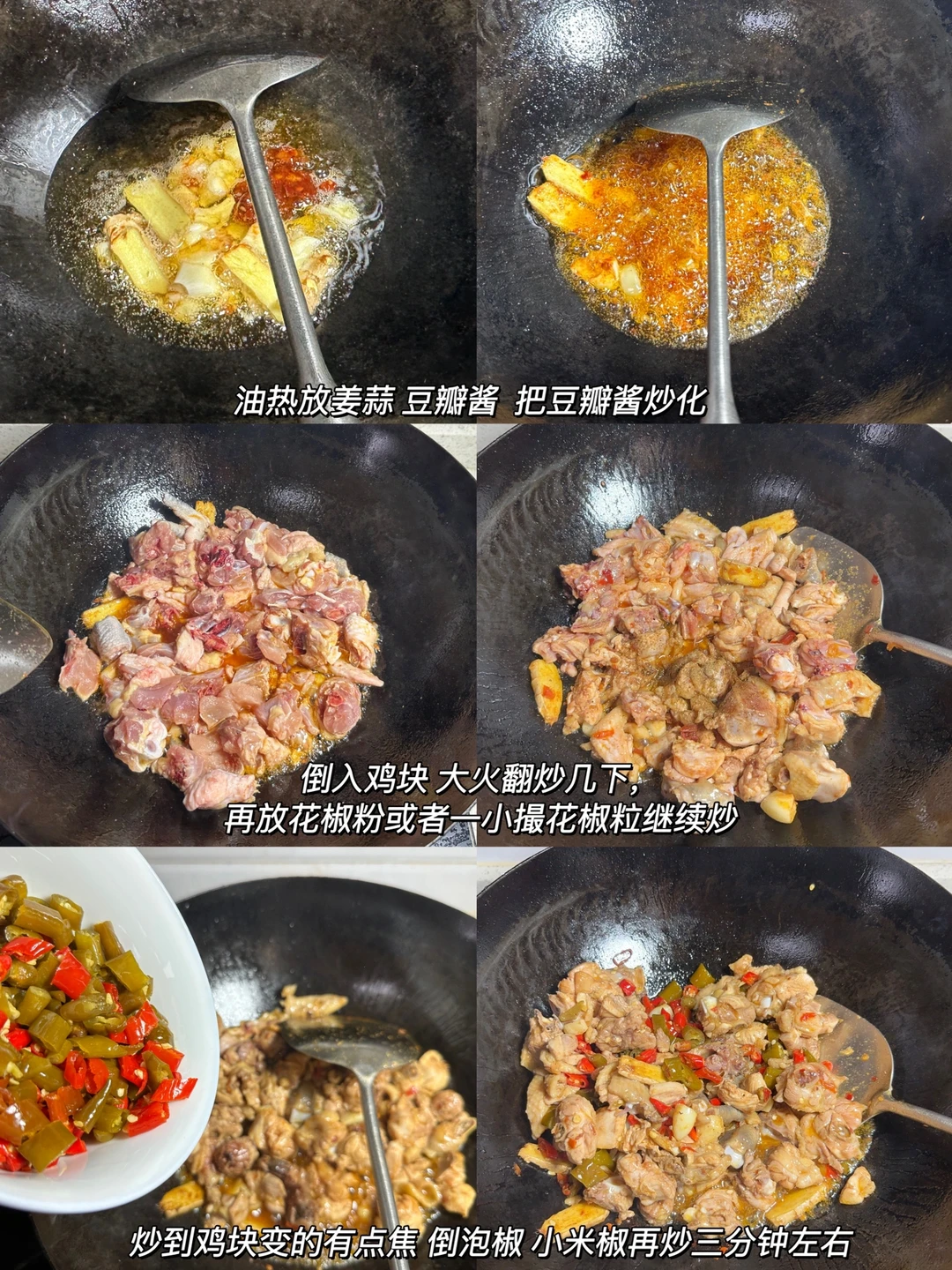 2⃣️:锅里倒油烧热 (比平时炒青菜的量多一点)放姜片 蒜 一勺豆瓣酱炒化,再放鸡块大火翻炒几下。撒点花椒粉(可替换成一小撮花椒粒)炒两三分钟。
