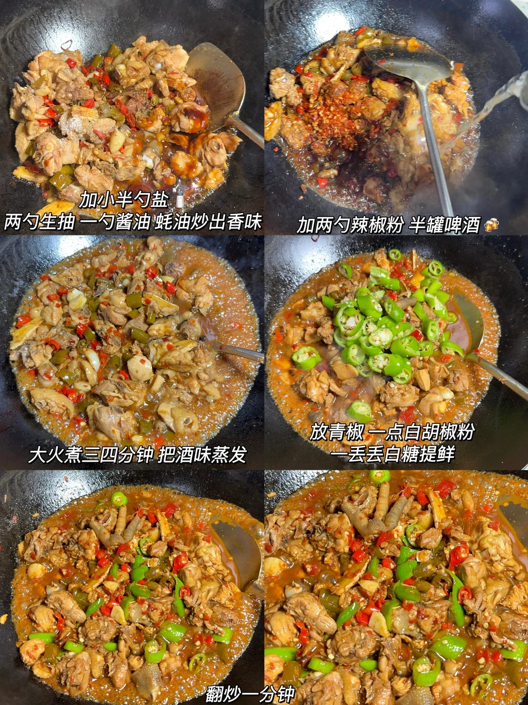 3⃣️:放小米椒 泡椒继续炒两三分钟。放小半勺盐,两勺生抽 一勺酱油 蚝油炒出香味 。放两勺辣椒粉 倒半罐啤酒(啤酒的量比鸡肉少一点)大火煮四分钟左右 蒸发酒味。