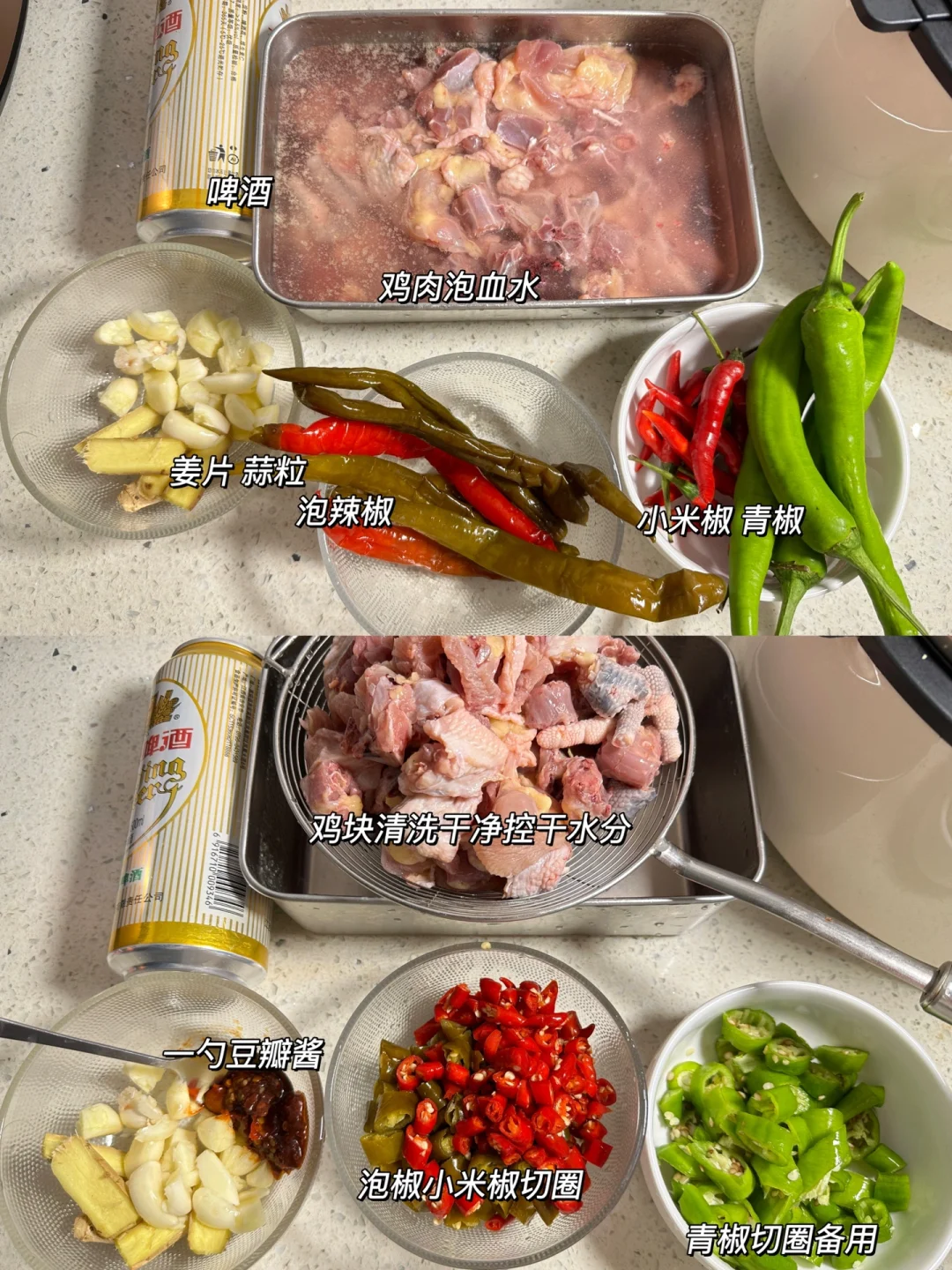 ✨食材:半只麻鸡(三黄鸡 鸡腿..都可)姜 蒜 小米椒 青椒 豆瓣酱 泡椒 辣椒粉 啤酒