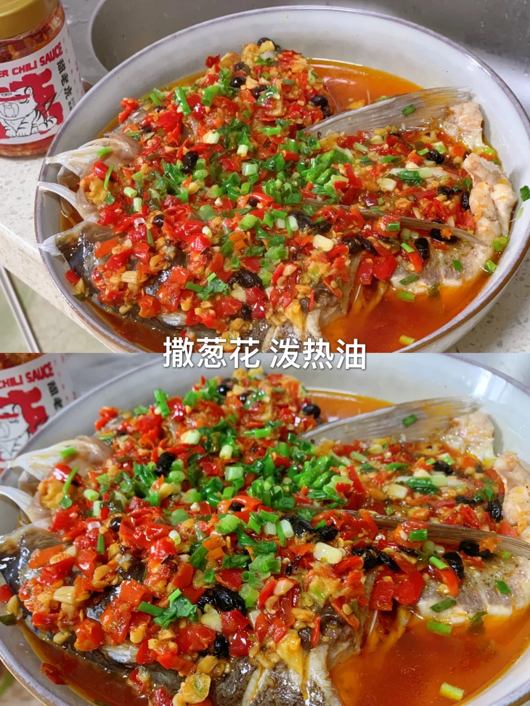 ✨食材:鱼头 剁椒酱 姜蒜 葱花 豆豉 1⃣️:鱼头清洗干净 下面划两刀 ,放入姜 葱 料酒 胡椒粉 鸡精腌制10分钟。 2⃣️:把姜蒜切碎 葱花放入碗里加入剁椒酱 豆豉 一勺蚝油 一勺🥄生抽。锅内烧热油 油热倒入碗里激发出香味。搅拌均匀 3⃣️:把腌鱼放的姜葱扔掉。从新在碗里垫姜片 葱放入鱼头 铺满酱料 水开之后蒸10分钟。 4⃣️:蒸好后撒上葱花 再泼上一点热油出香味[doge] 真的很简单的一道大菜哈哈哈哈 快去试试吧 好好吃饭🤟🏻
