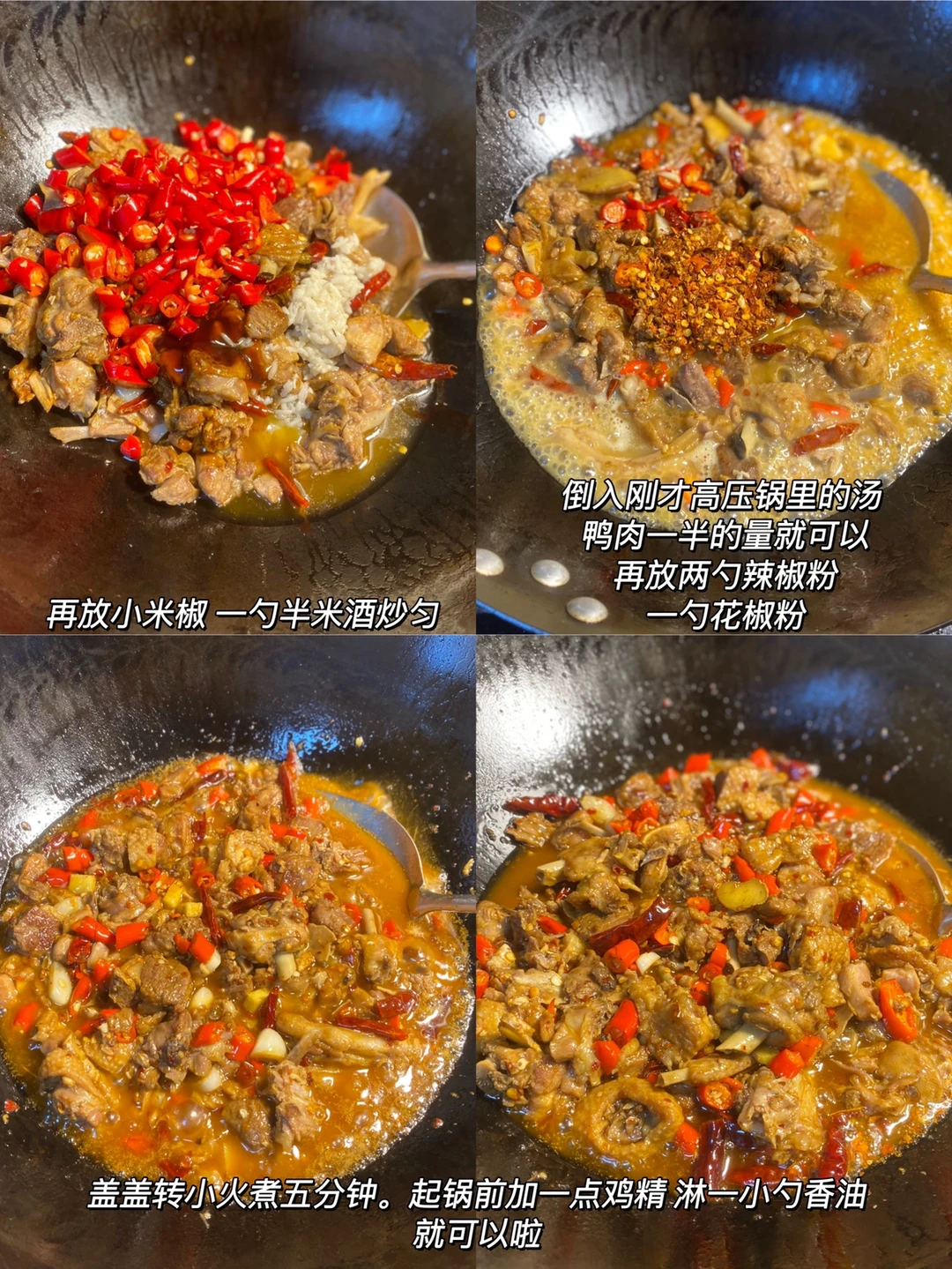 锅里倒底油,放姜蒜粒 干辣椒炒香,倒入鸭肉 加一勺酱油炒上色。再放一勺生抽 蚝油,小米椒 米酒大火炒匀。