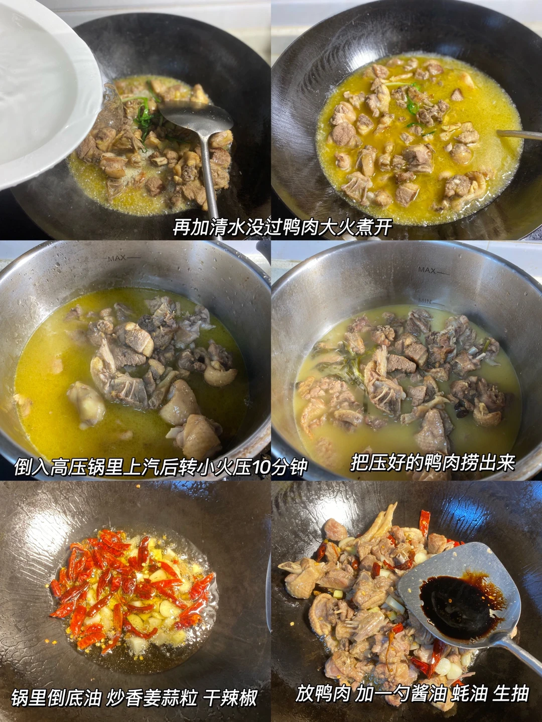 炒匀后把高压锅里的汤倒进来 ,鸭肉一半的量就可以