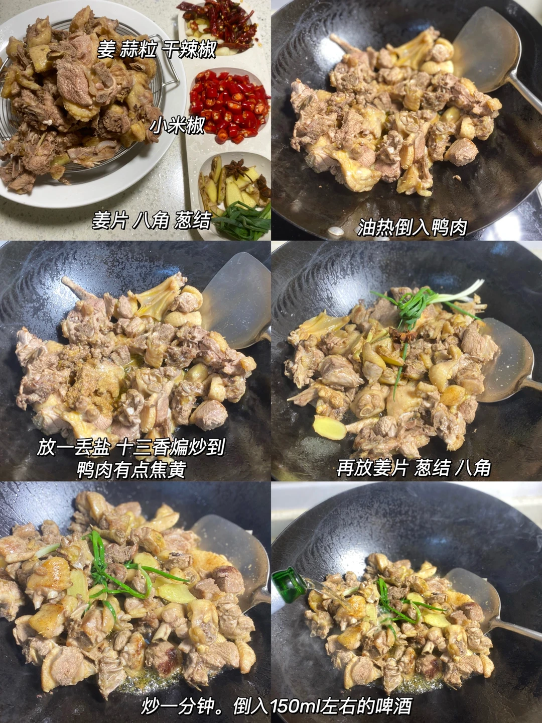 2⃣️:锅里倒一点油 放入鸭肉 加小半勺盐,十三香大火煸炒到有点焦黄。然后放姜片 葱结 八角再炒一分钟,倒入150ml的啤酒 再加清水(刚好没过鸭肉的量)大火煮开转入高压锅上汽后转小火10分钟