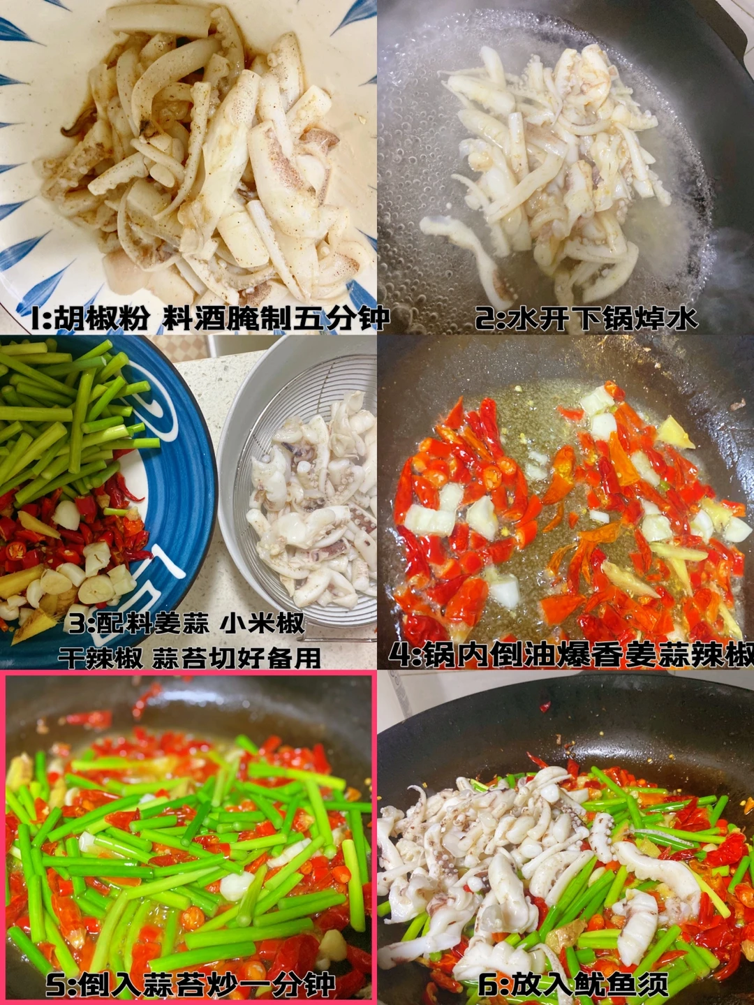 食材:鱿鱼须 蒜苔 姜蒜 小米椒 干辣椒