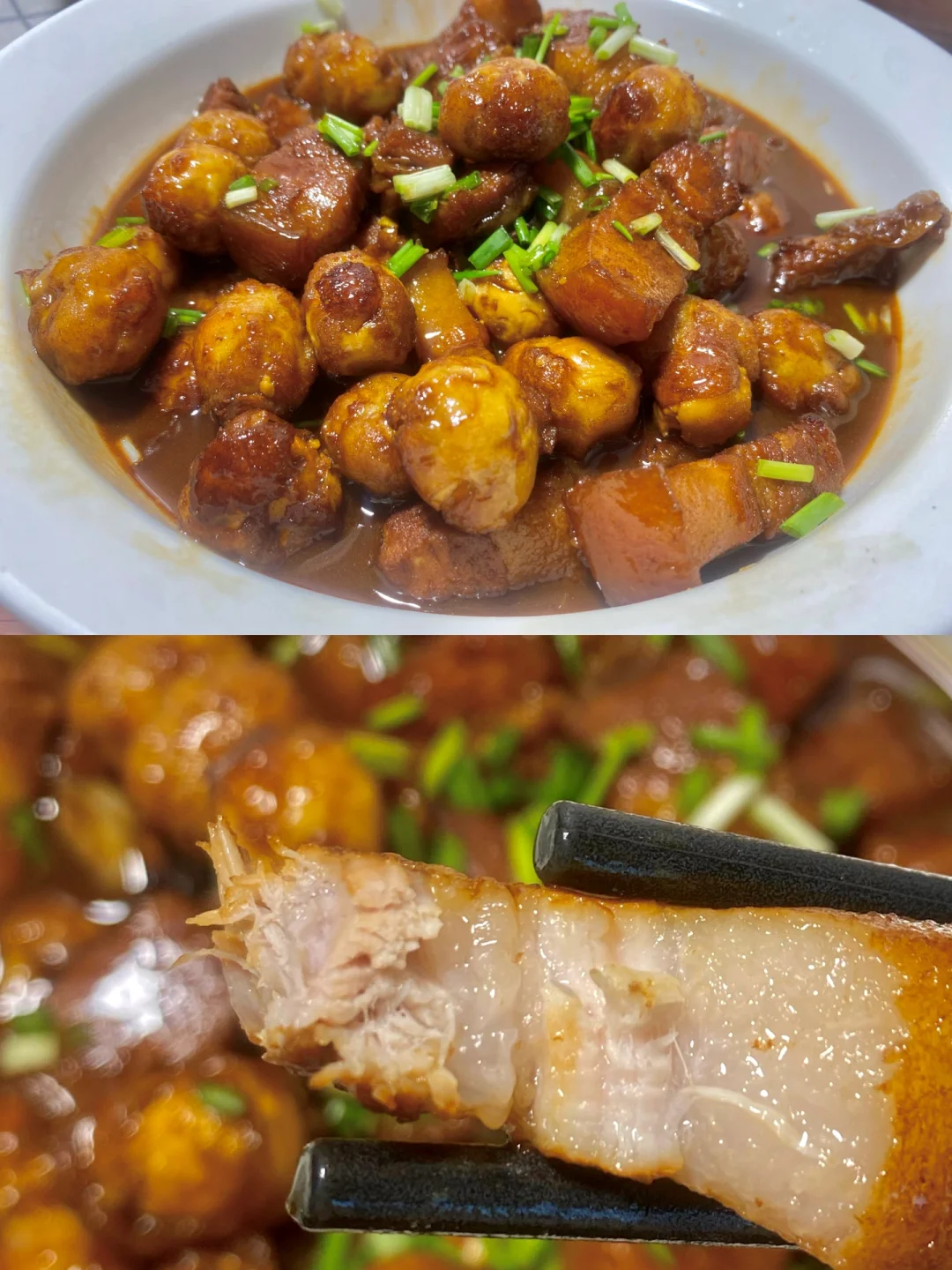 4⃣️:加热水♨️没过五花肉,加葱结大火烧开后转入砂锅小火盖盖炖30分钟(也可以直接在锅里炖)时间到 把葱结捞出来,放入鹌鹑蛋 蒜瓣继续煮10分钟。放一小勺鸡粉 大火收汁 (喜欢吃甜口的可以再加点白糖)