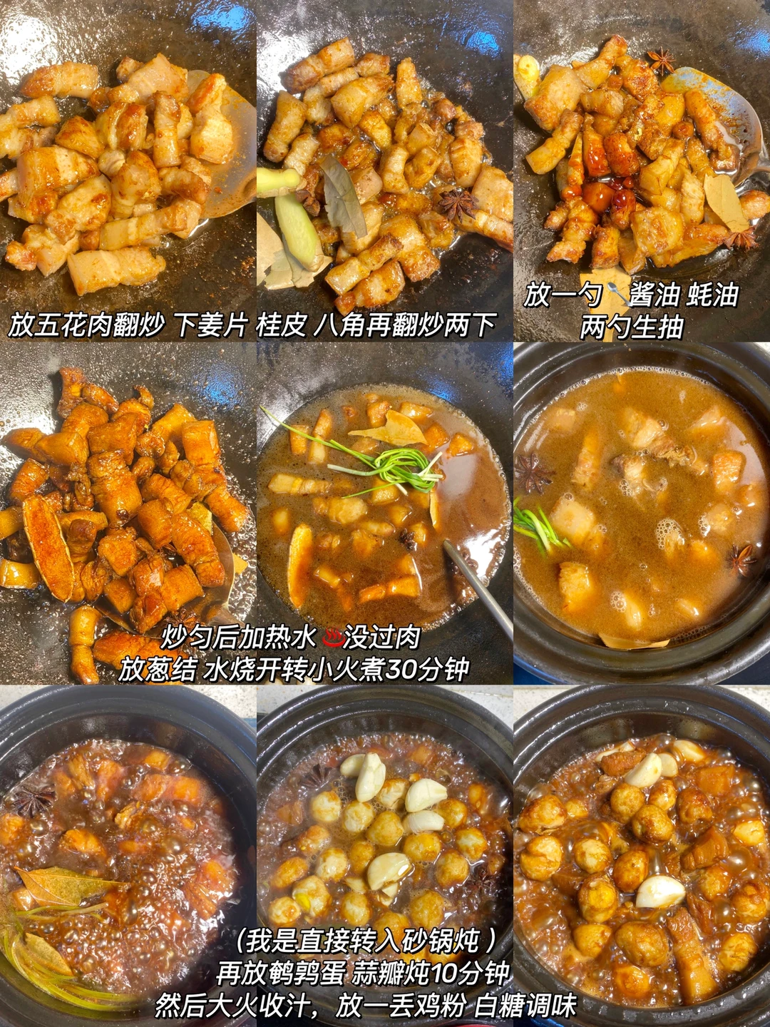 ✨食材:五花肉一斤 鹌鹑蛋 姜 蒜 葱结 八角两颗 香叶一片 桂皮一小块(可以再加一片白芷)白糖