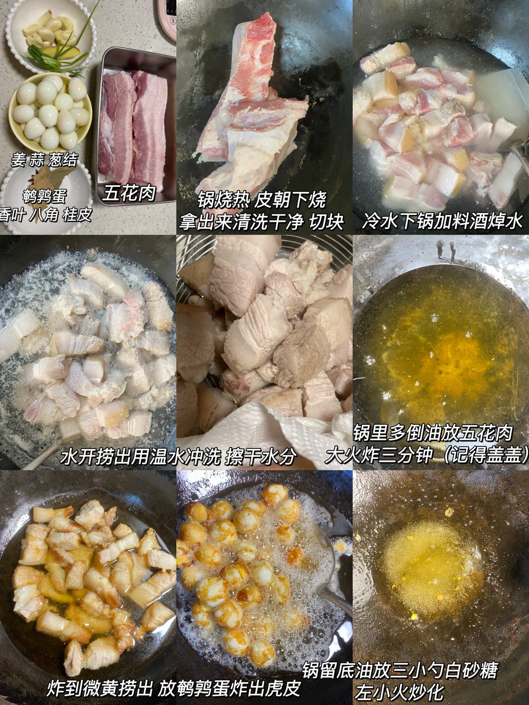 1⃣️:鹌鹑蛋煮熟剥壳备用,铁锅烧热,把五花肉皮朝下煎一分钟左右,拿出来用温水冲洗干净切块。肉块加冷水下锅放料酒大火煮开后捞出用温水冲洗干净 擦干水分