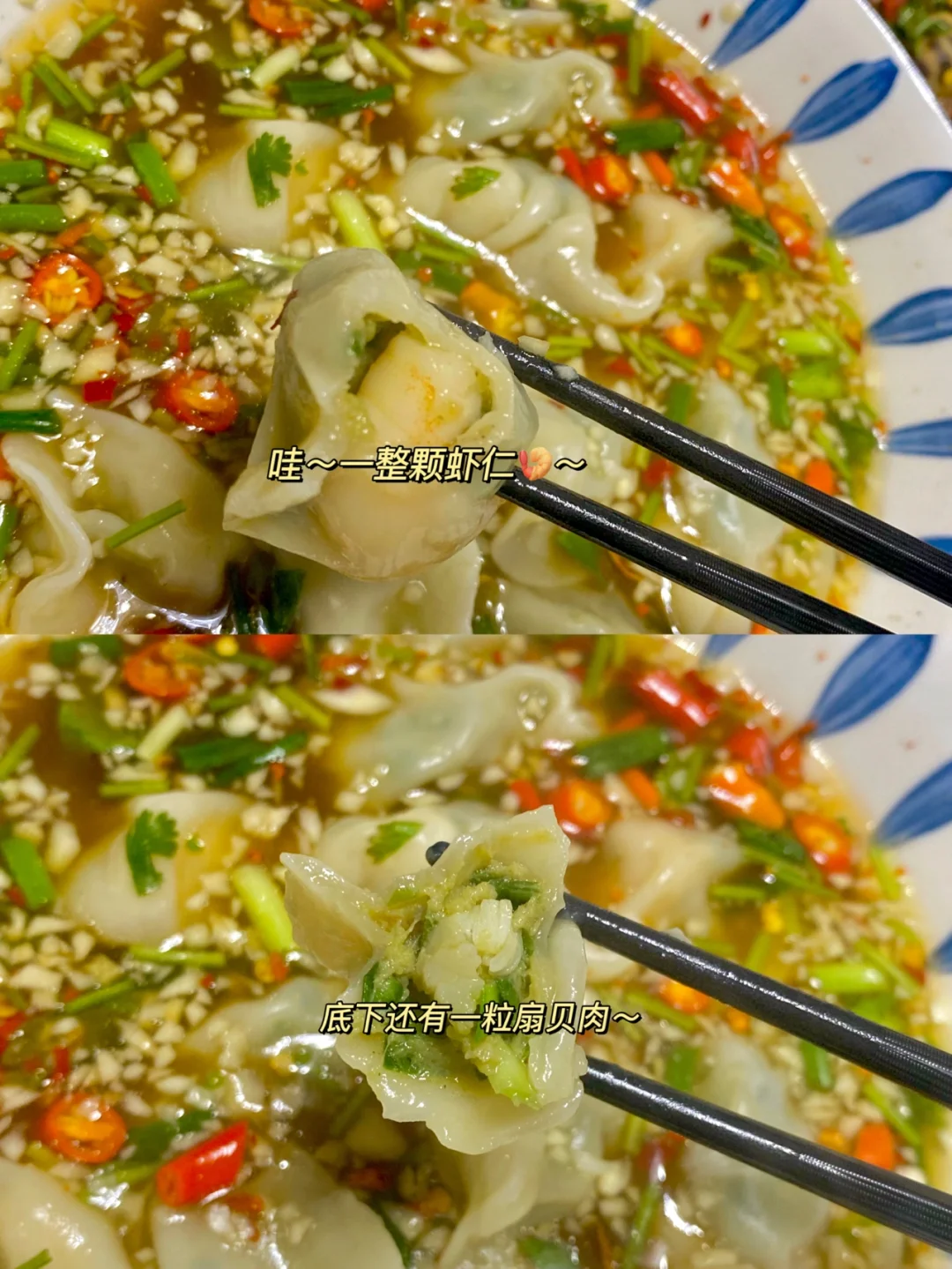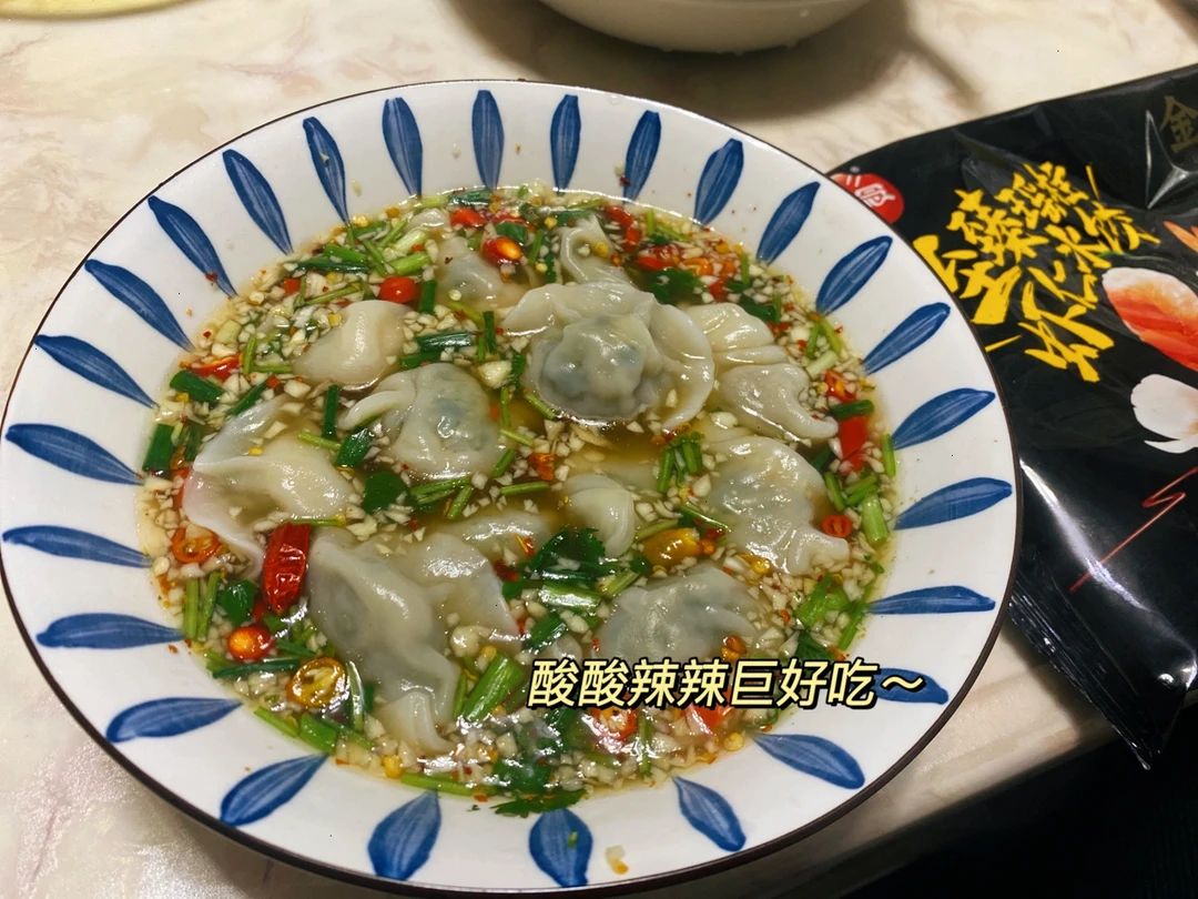 酸酸辣辣 特别开胃~这个饺子太让我惊艳了 咬开皮有一整颗虾仁 吃到底下还有一粒扇贝肉 [大笑R][大笑R]味道鲜美 太好吃了吧~