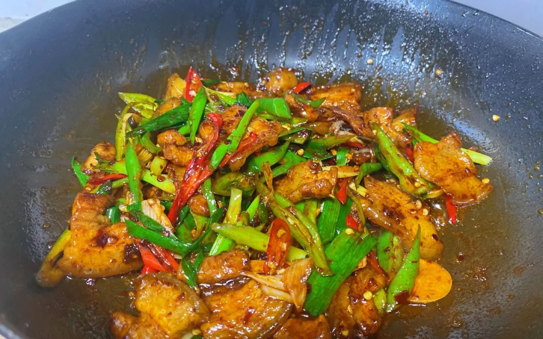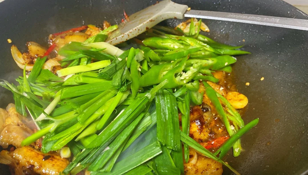 5⃣️:下青椒蒜叶快速翻炒一分钟。出锅~