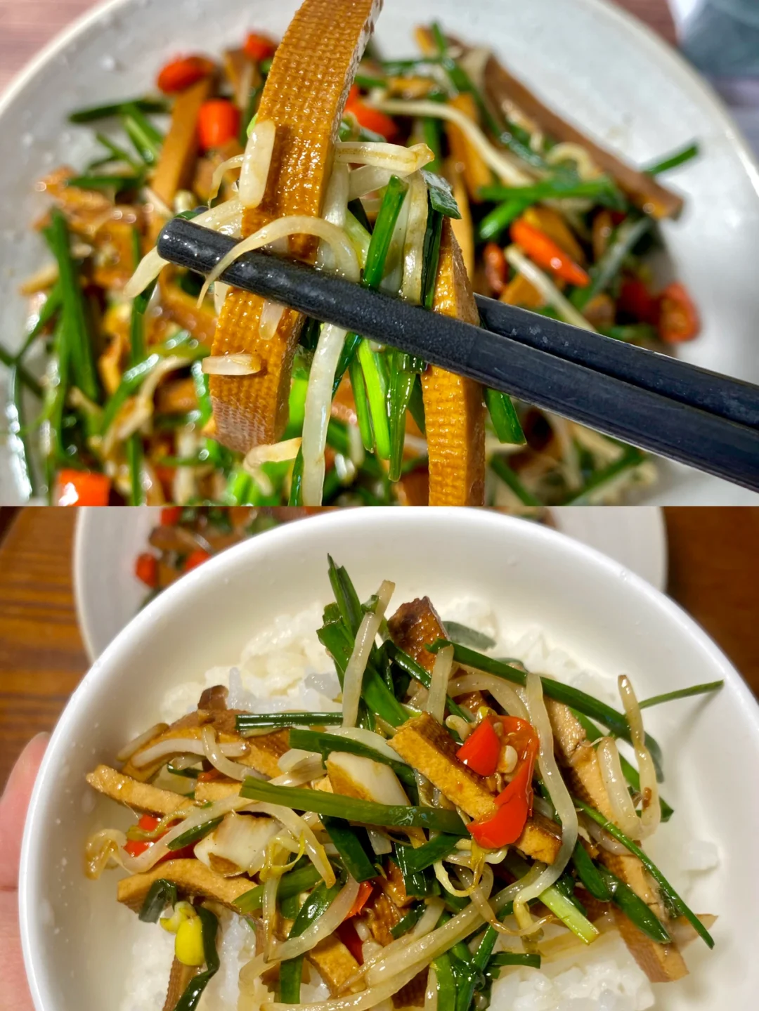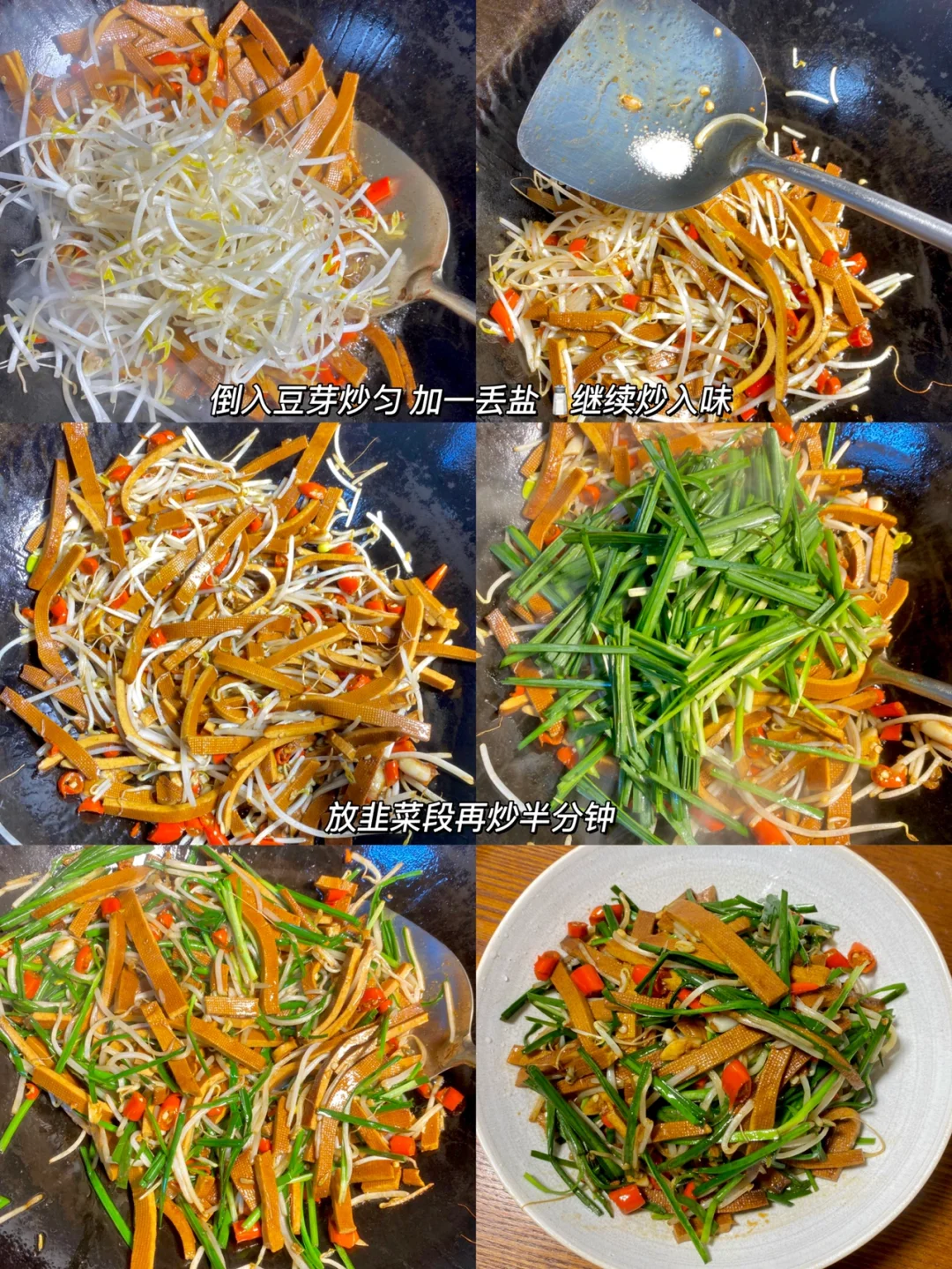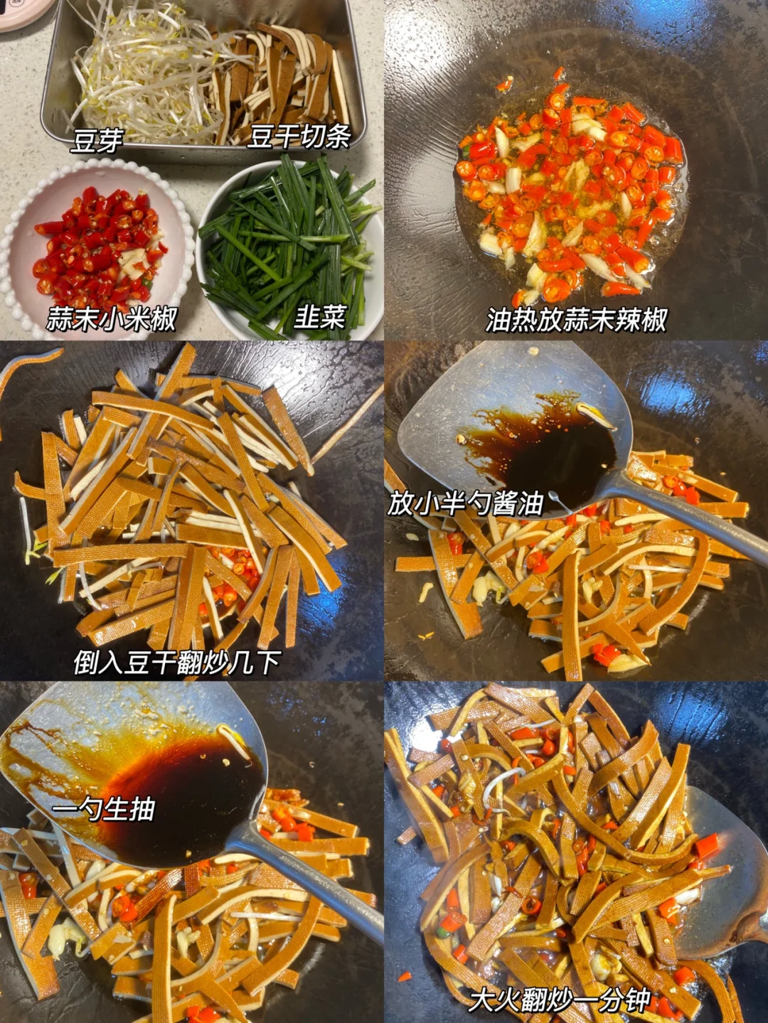 脆脆的豆芽 软嫩的香干 口感很丰富[派对R] ✨食材:香干 豆芽 韭菜 蒜 小米椒 1⃣️:豆干切条,韭菜切段,小米椒蒜末切碎备用 锅里倒油放小米椒蒜末翻炒几下,再倒豆干炒 小半勺酱油,一勺🥄生抽大火翻炒一分钟入个味。 2⃣️:倒入豆芽,放一丢丢盐翻炒均匀。再放韭菜段炒半分钟。还可以再加一丢丢鸡精哦~炒匀可以起锅啦[派对R] 记得买绿豆芽哦~今天买韭菜都没看到很嫩的[哭惹R][哭惹R] 好好吃饭呀🤘🏻