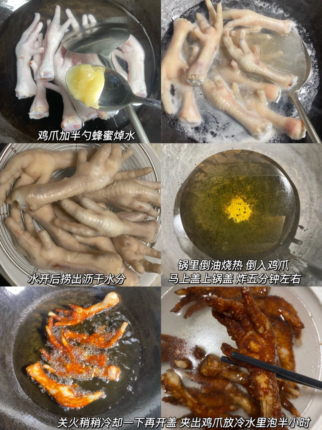 1⃣️:鸡爪剪掉指甲,冷水下锅加半勺蜂蜜大火煮开捞出沥干水分(加蜂蜜是为了炸的时候上色)我这边十只鸡爪分两次炸,省点油。
