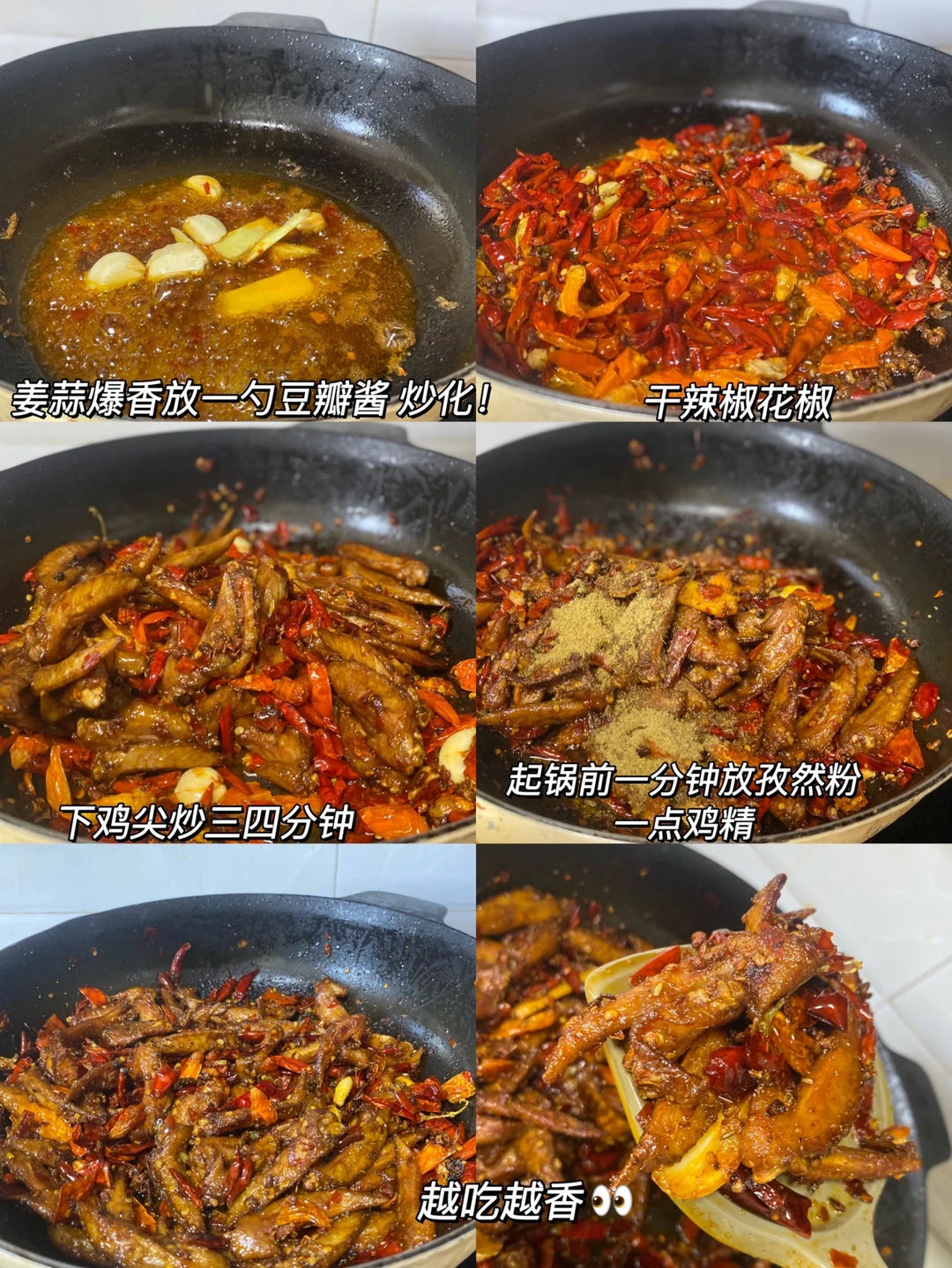 4⃣️:锅留底油 放入姜蒜 一勺🥄豆瓣酱 (一定要炒化!多炒一会 或者剁碎来炒)然后放入剪好的干辣椒 花椒小火炒出辣味 转大火放入鸡尖 炒四分钟。