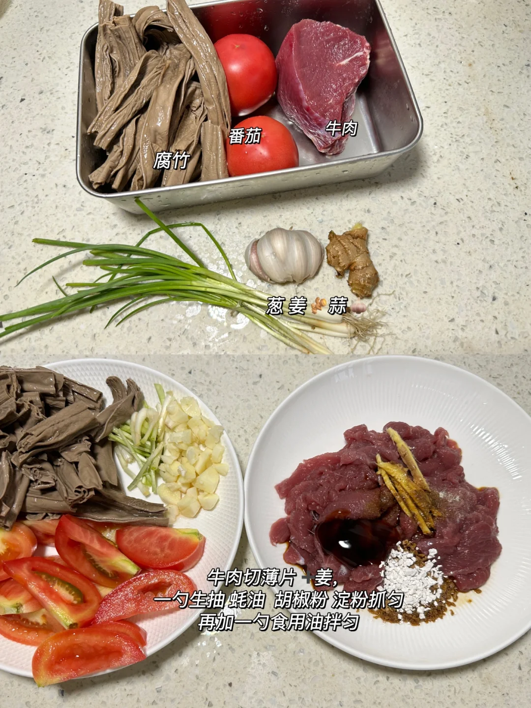1⃣️:腐竹提前泡发切段,牛肉切薄片加姜 一勺生抽 蚝油 淀粉 ,撒点白胡椒粉抓匀 再加食用油锁住水份。