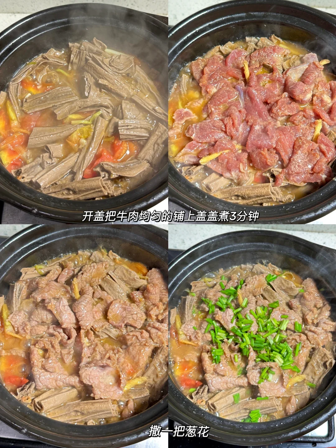 3⃣️:开盖 (可以尝尝腐竹的味道 根据个人口味加点鸡精)把牛肉尽量分散开摆上去,再把盖子盖上煮三分钟。