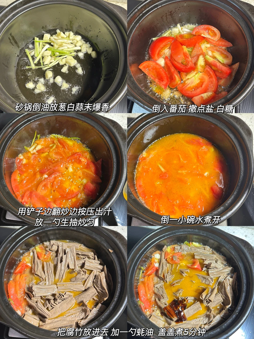2⃣️:砂锅烧热倒油 放蒜 葱白爆香 ,把番茄块放进去 撒盐 白糖按压出汁,加一勺生抽炒匀。倒入一小碗水煮开 把腐竹放进来,加一勺蚝油 盖盖中火煮5分钟。