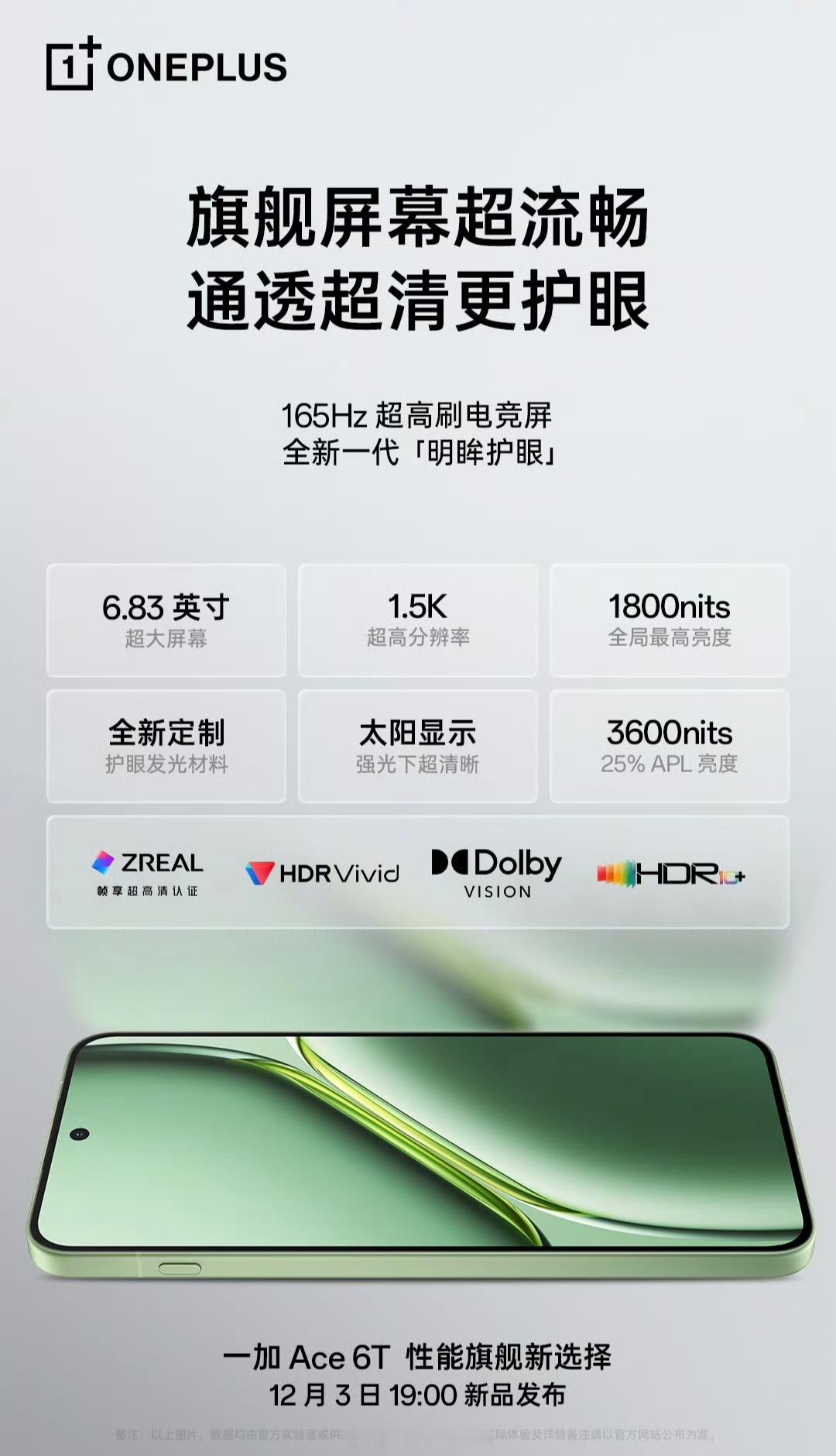 一加 Ace 6T 继续预热,1.5K 165Hz 超高刷电竞屏、索尼 5000 万像素旗舰大底主摄、3D 超声波指纹,这周三发布,看能不能来个交个朋友价。
