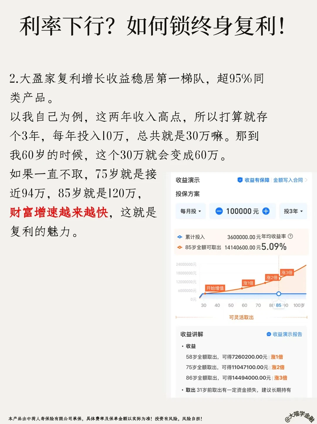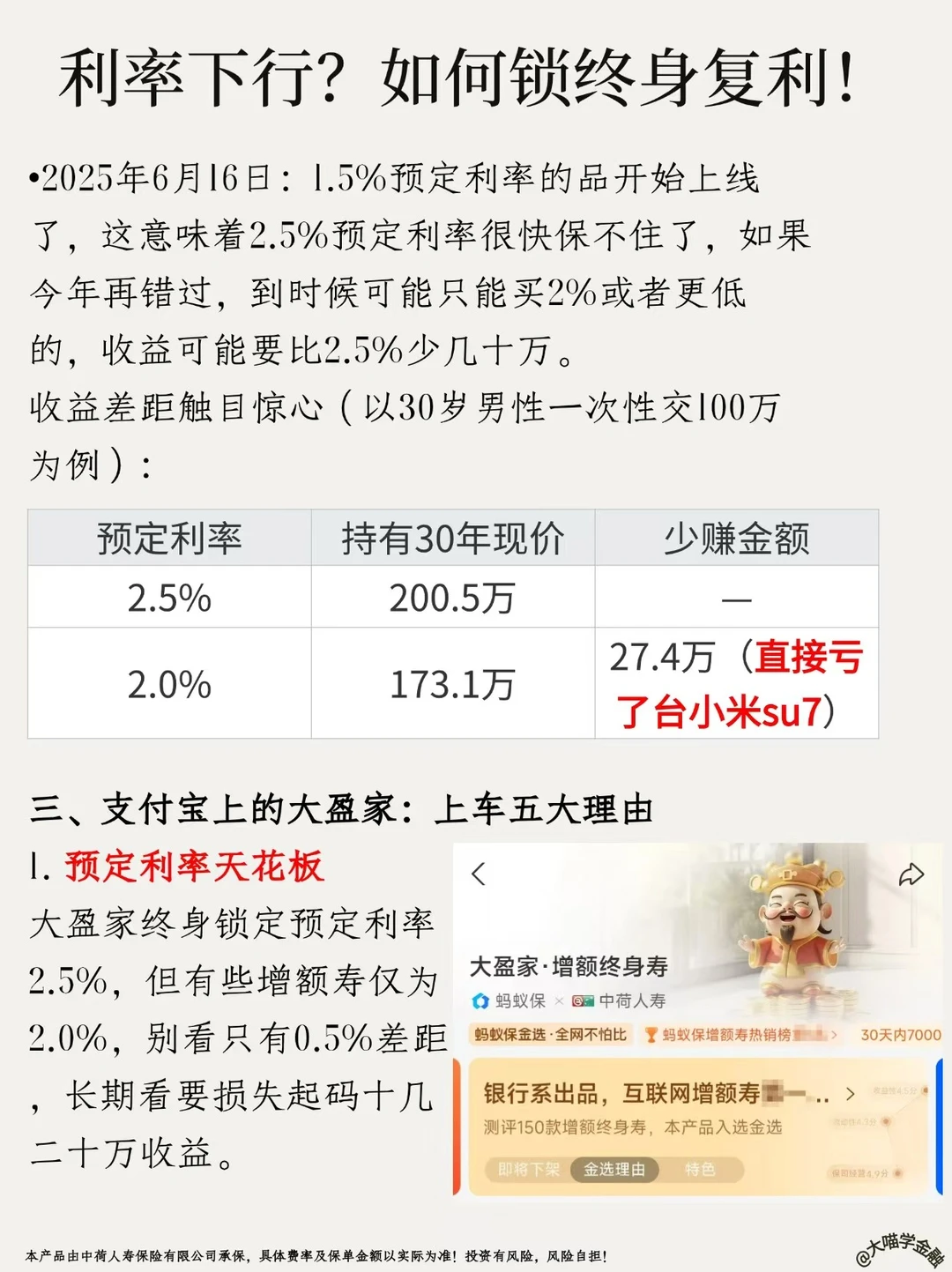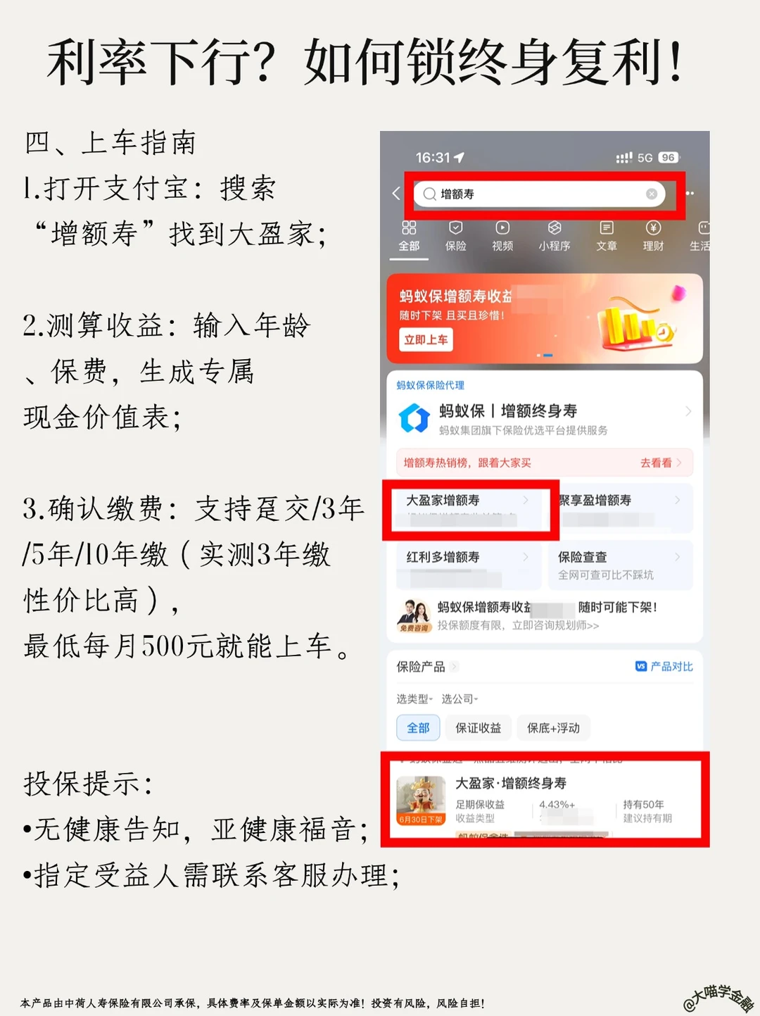 上周发笔记说利率越低越要存钱,评论区炸了🔥!500+人追着问增额寿险!今天大喵实测——支付宝「大盈家增额终身寿」,6月30日下架,倒计时11天❗手慢无!!