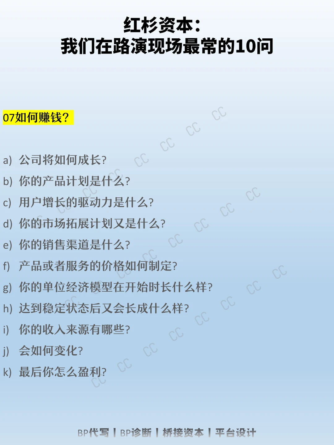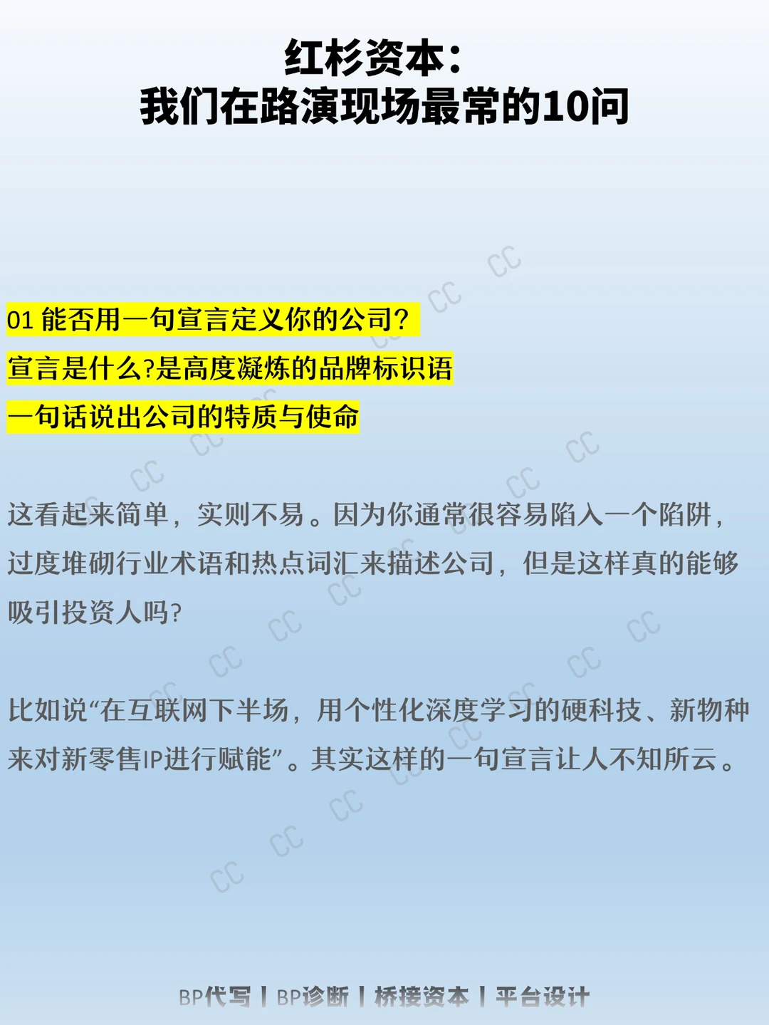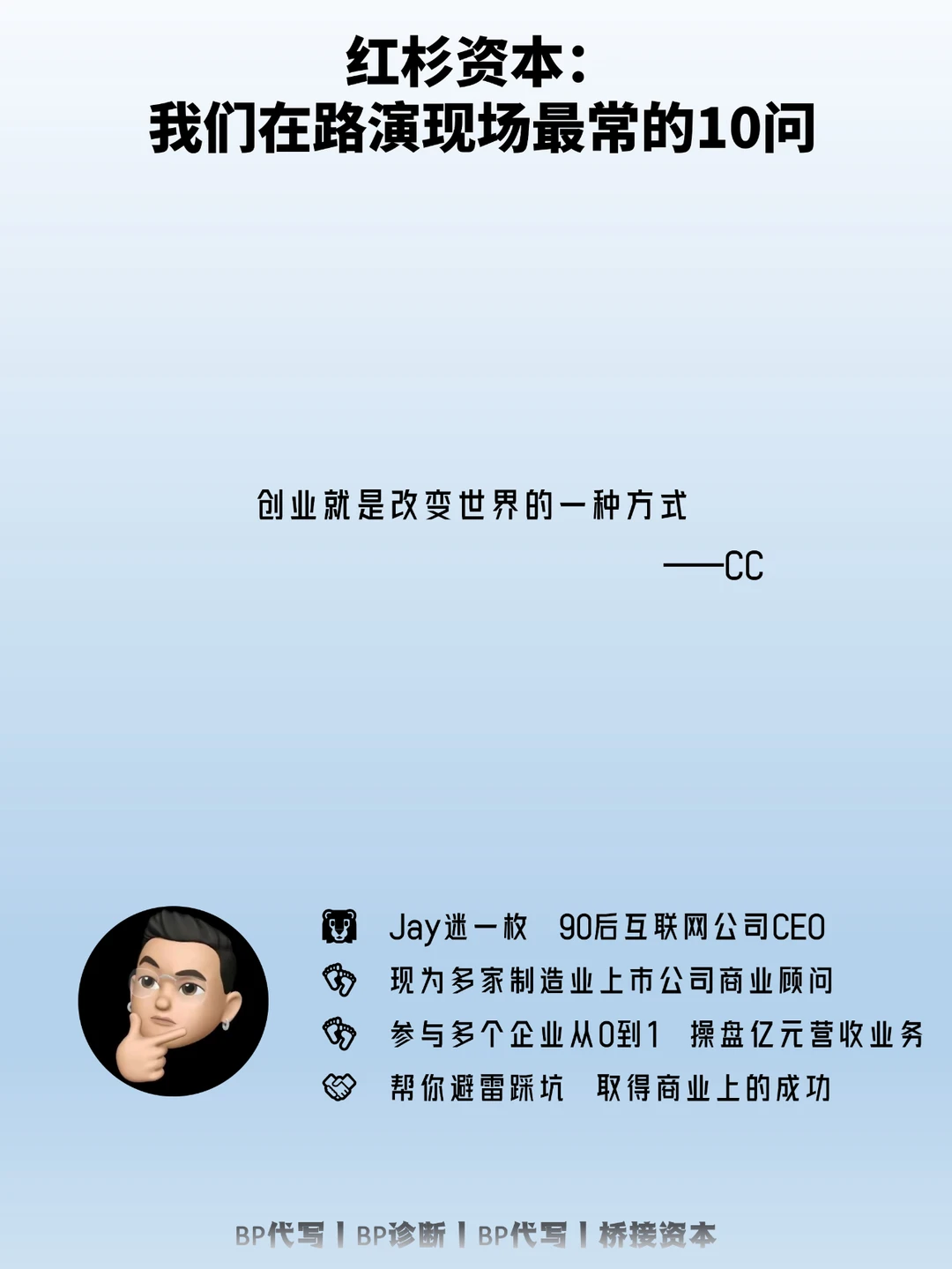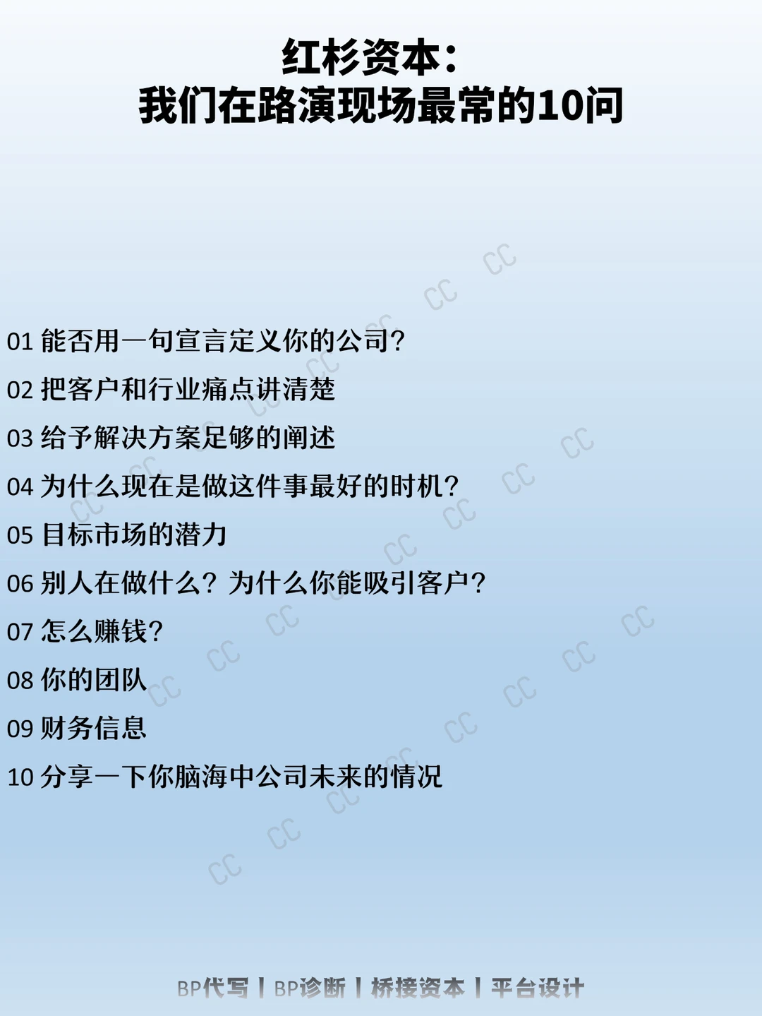 01 能否用一句宣言定义你的公司? 02 把客户和行业痛点讲清楚 03 给予解决方案足够的阐述 04 为什么现在是做这件事最好的时机? 05 目标市场的潜力 06 别人在做什么?为什么你能吸引客户? 07 怎么赚米? 08 你的团队 09 财务信息 10 分享一下你脑海中公司未来的情况