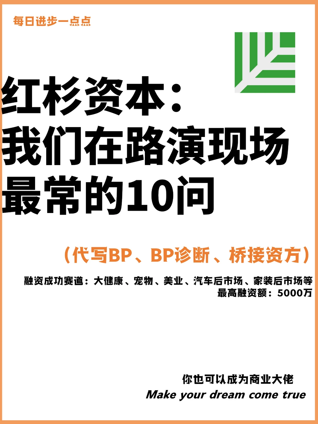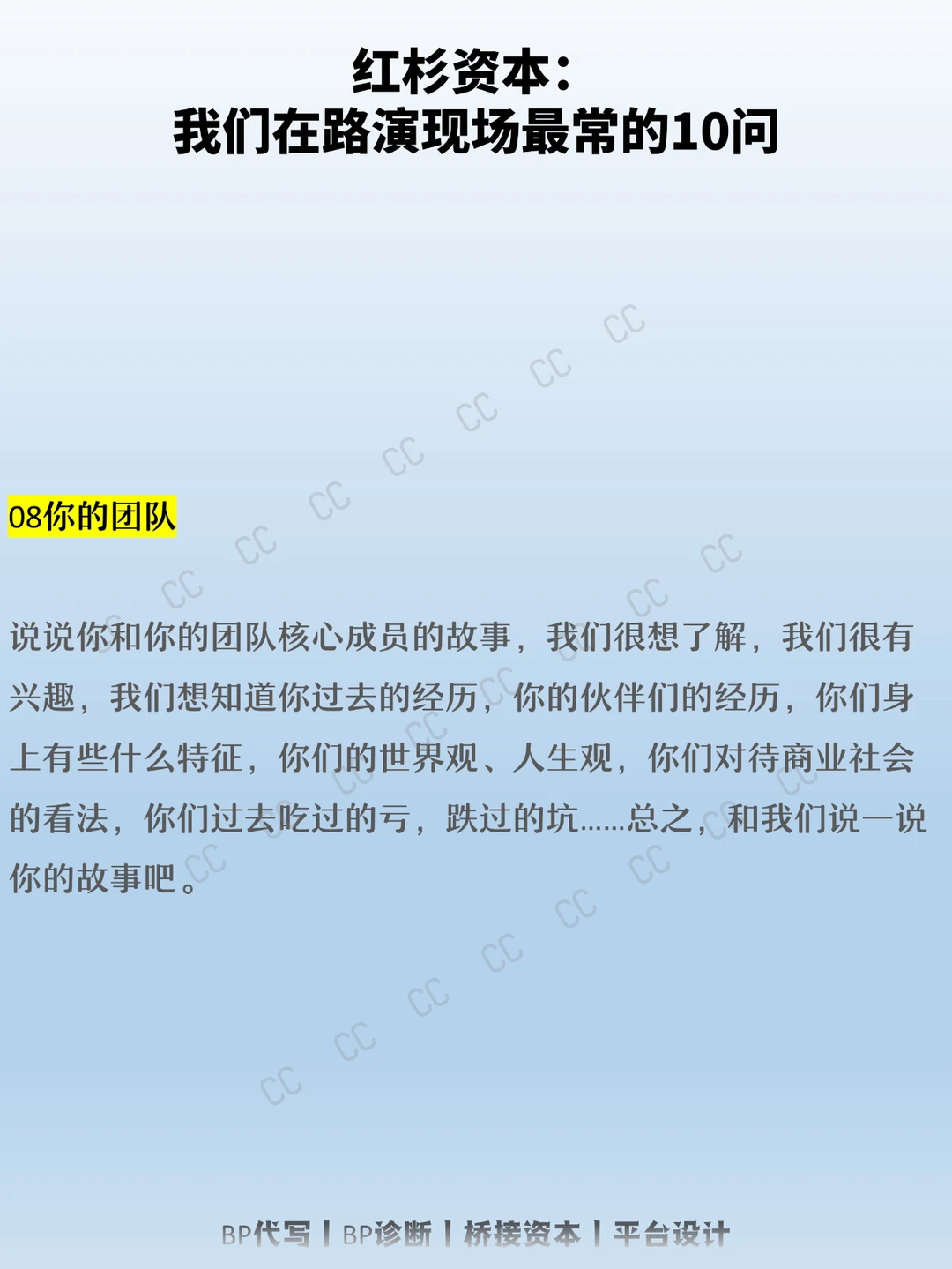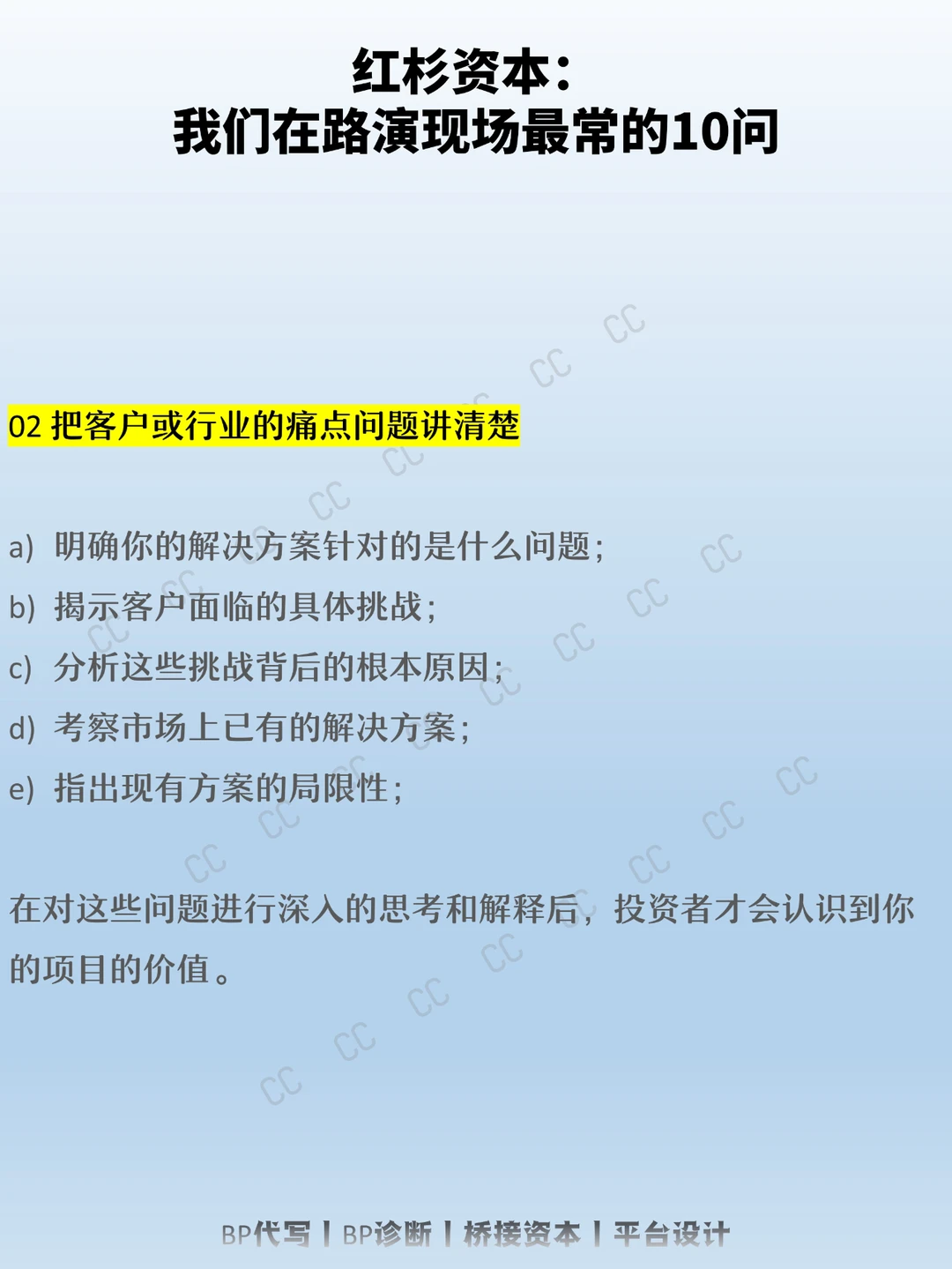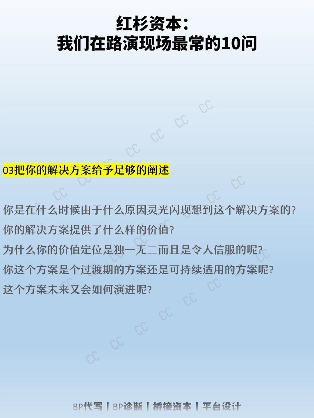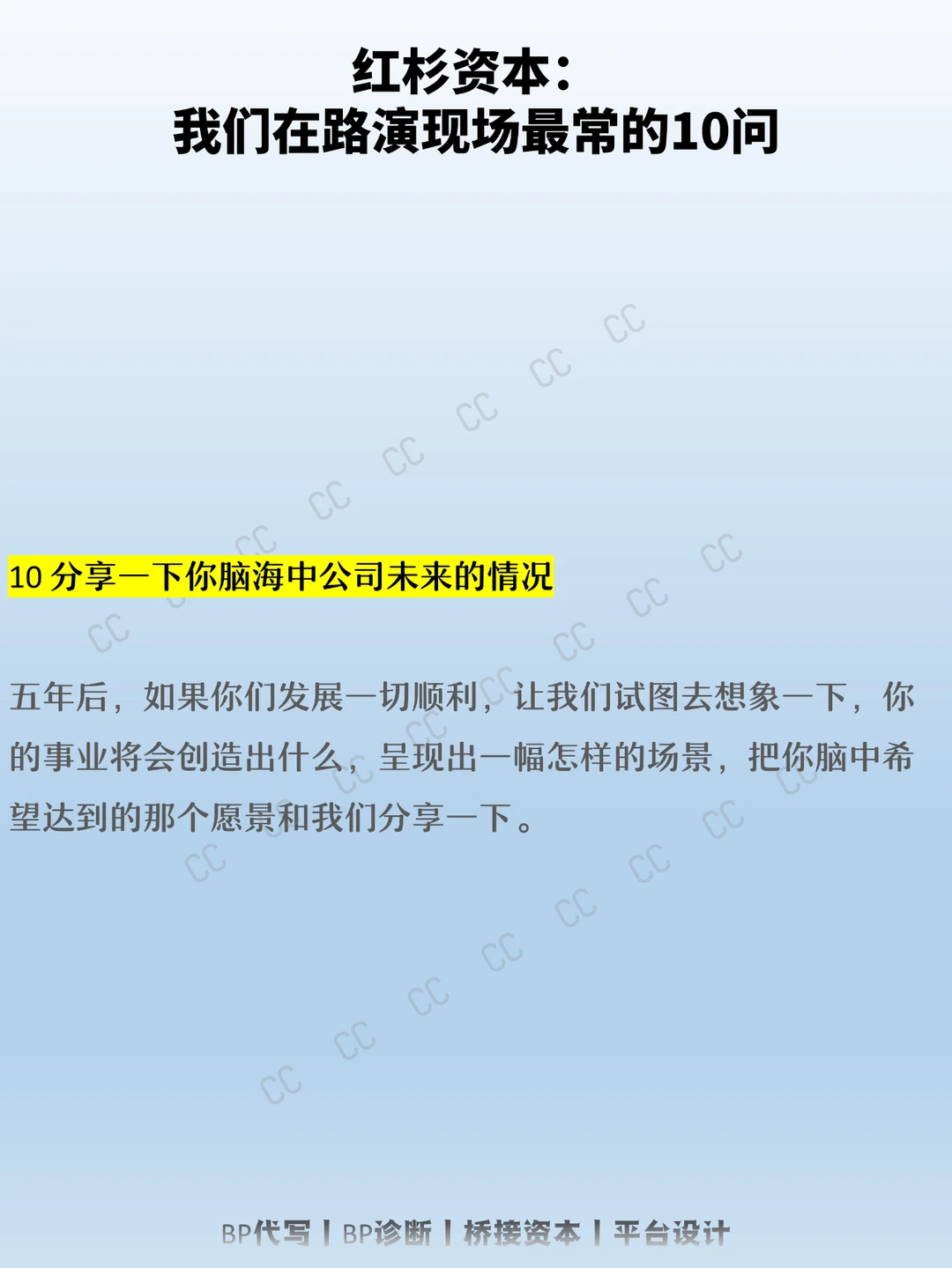 01 能否用一句宣言定义你的公司? 02 把客户和行业痛点讲清楚 03 给予解决方案足够的阐述 04 为什么现在是做这件事最好的时机? 05 目标市场的潜力 06 别人在做什么?为什么你能吸引客户? 07 怎么赚米? 08 你的团队 09 财务信息 10 分享一下你脑海中公司未来的情况
