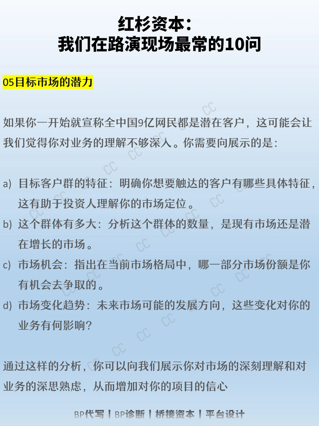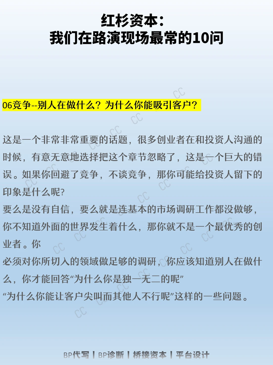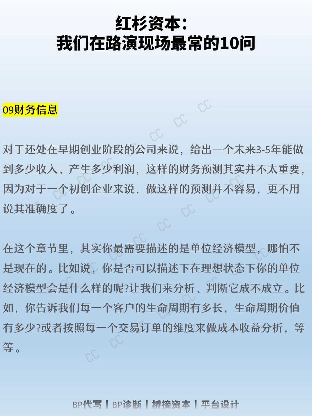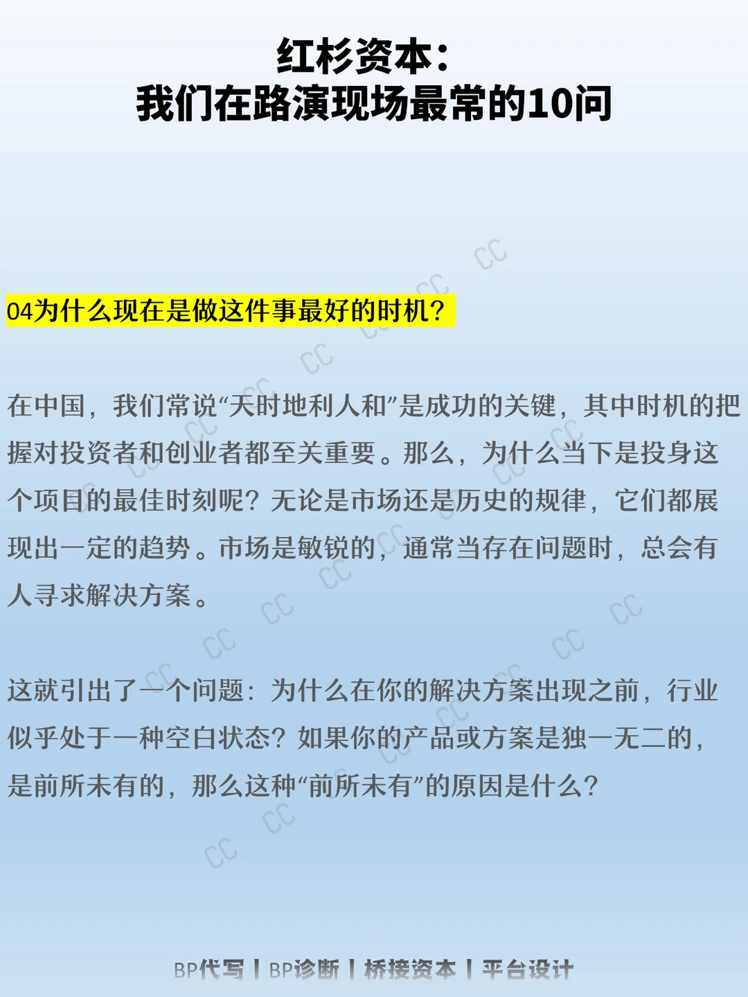01 能否用一句宣言定义你的公司? 02 把客户和行业痛点讲清楚 03 给予解决方案足够的阐述 04 为什么现在是做这件事最好的时机? 05 目标市场的潜力 06 别人在做什么?为什么你能吸引客户? 07 怎么赚米? 08 你的团队 09 财务信息 10 分享一下你脑海中公司未来的情况