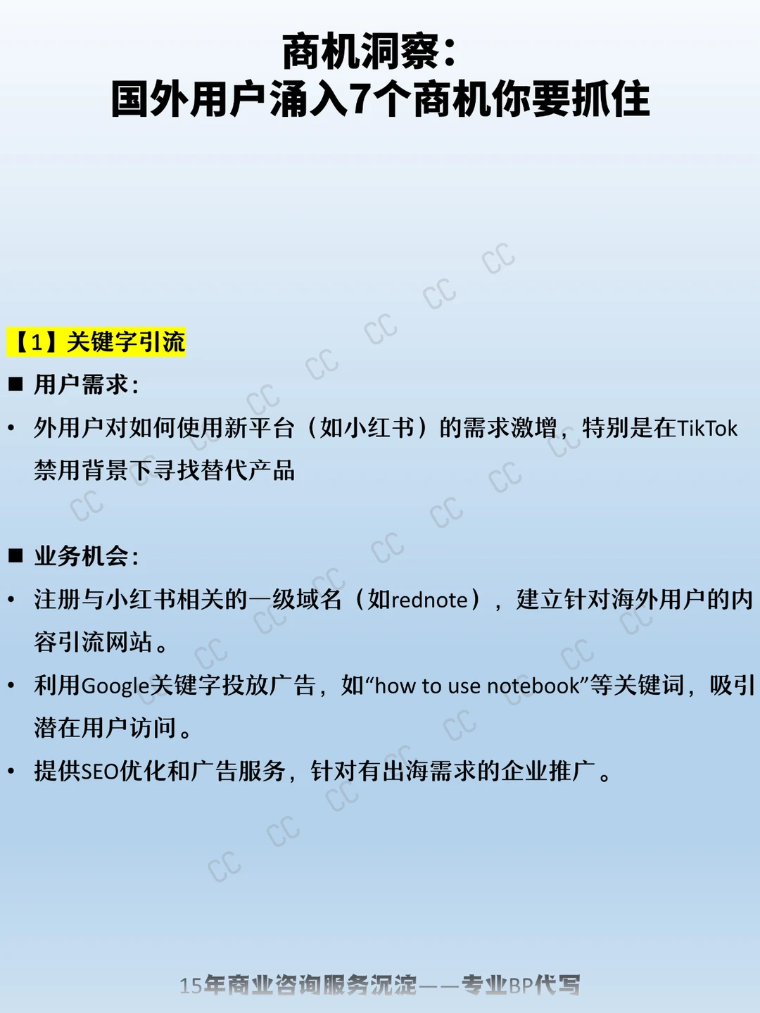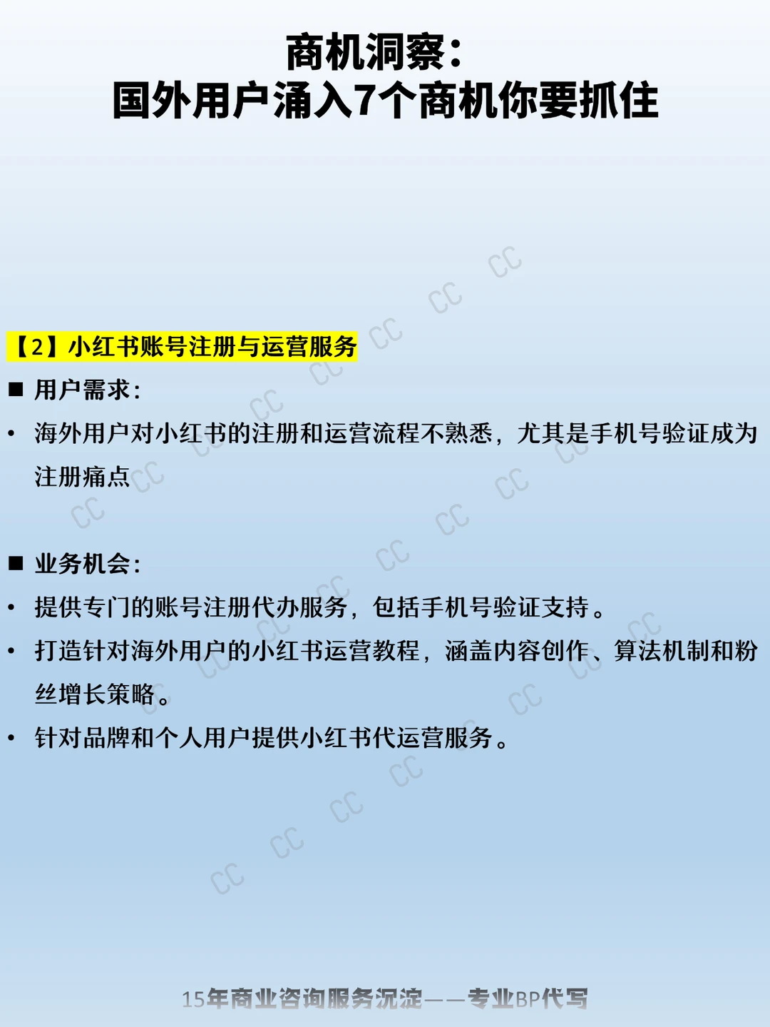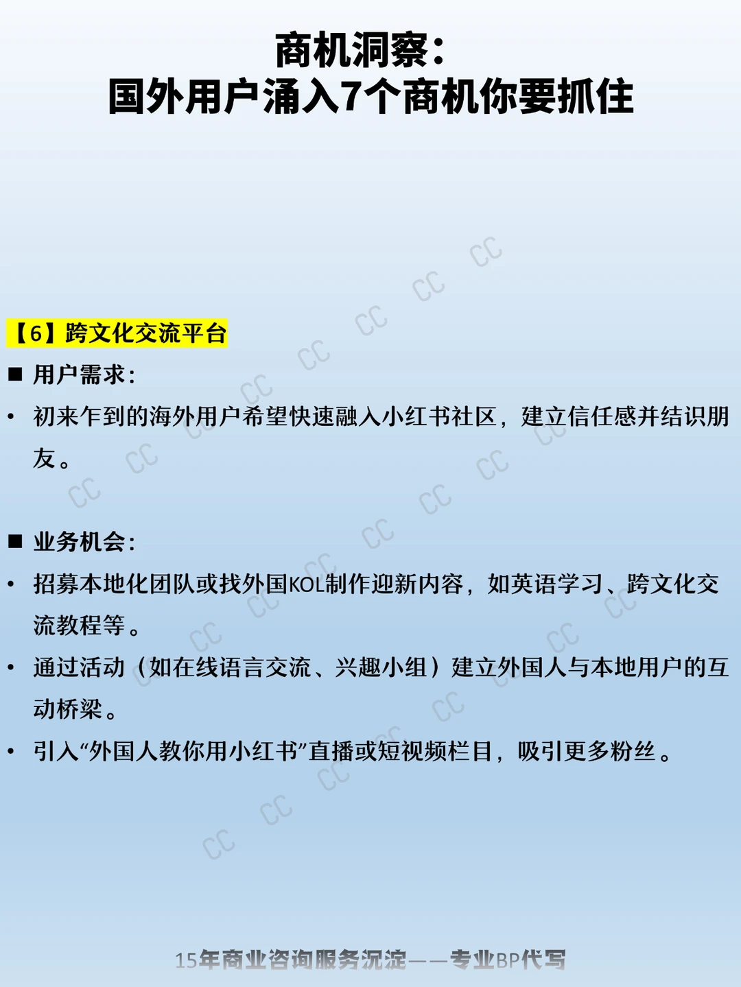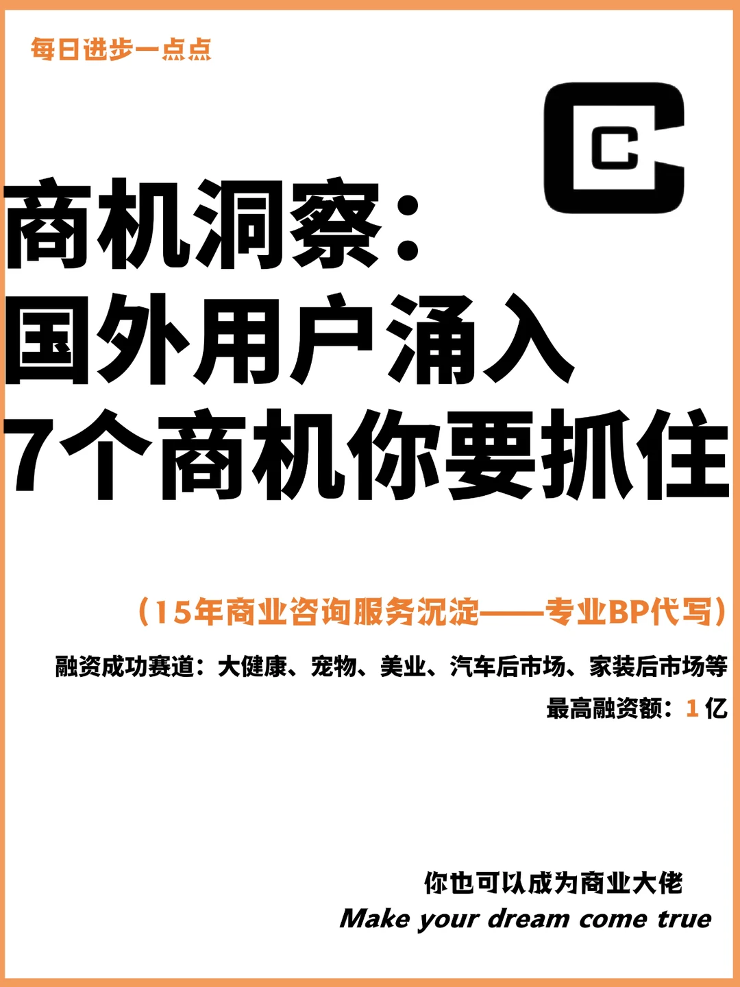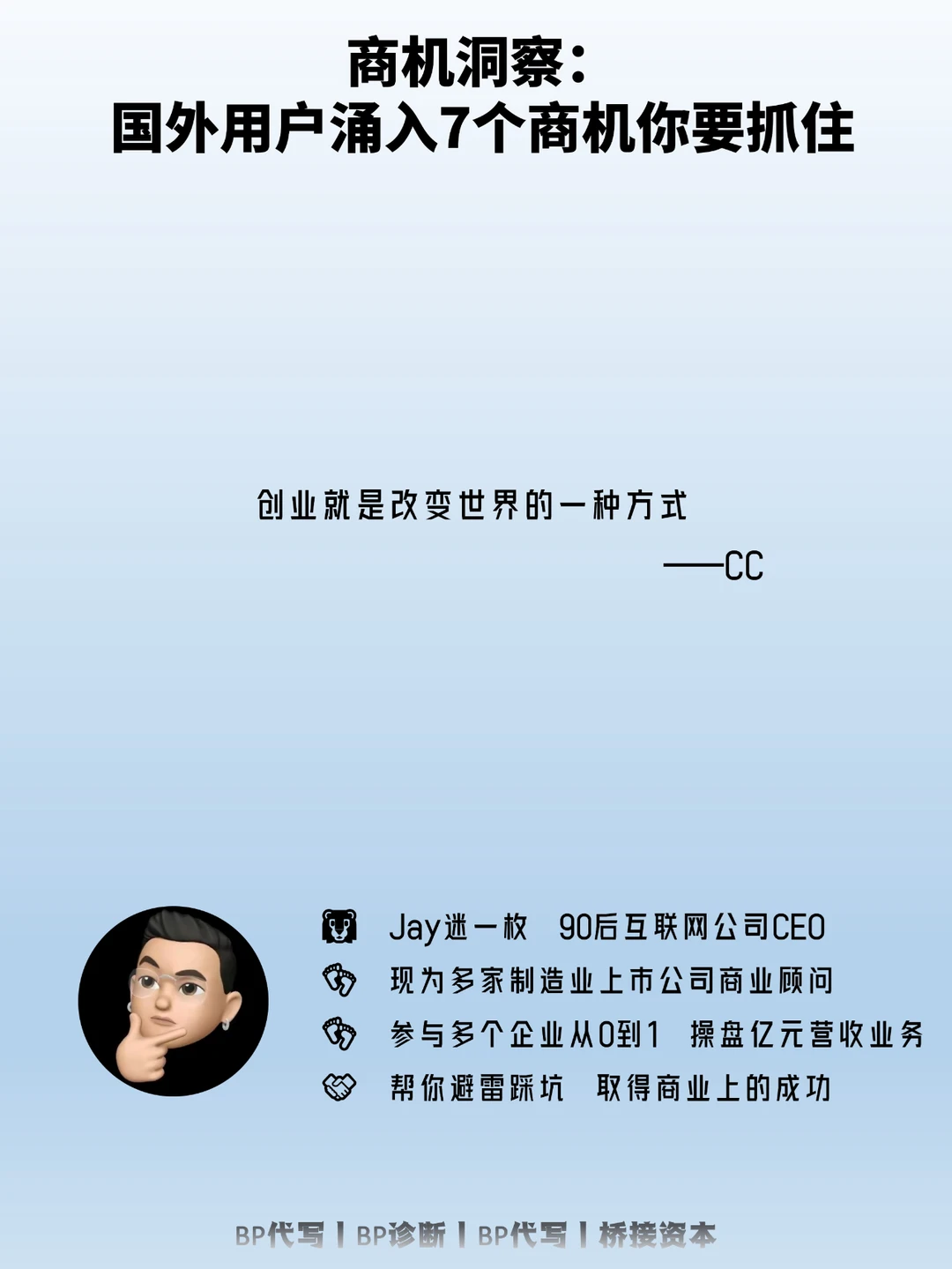 今早,CC醒来一刷,发现画风变了 不少来自海外的用户突然涌进 纷纷留言说是他们第一次使用这个平台,场面相当热闹。 以下七个业务机会你要抓住啦~ 1.关键词优化:抓住海外用户流量机遇 2.注册与运营服务:解决痛点,高效布局 3.出口转内销:抓住流量红利,拓展国内市场 4.内容迁移工具:提供高效解决方案 5.海外创作者资源库:精准对接商机 6.跨文化交流服务:搭建国际用户互动桥梁 7.旅游服务代理:借海外热潮拓展新业务 商业计划书 商业模式 融资 创业 商机