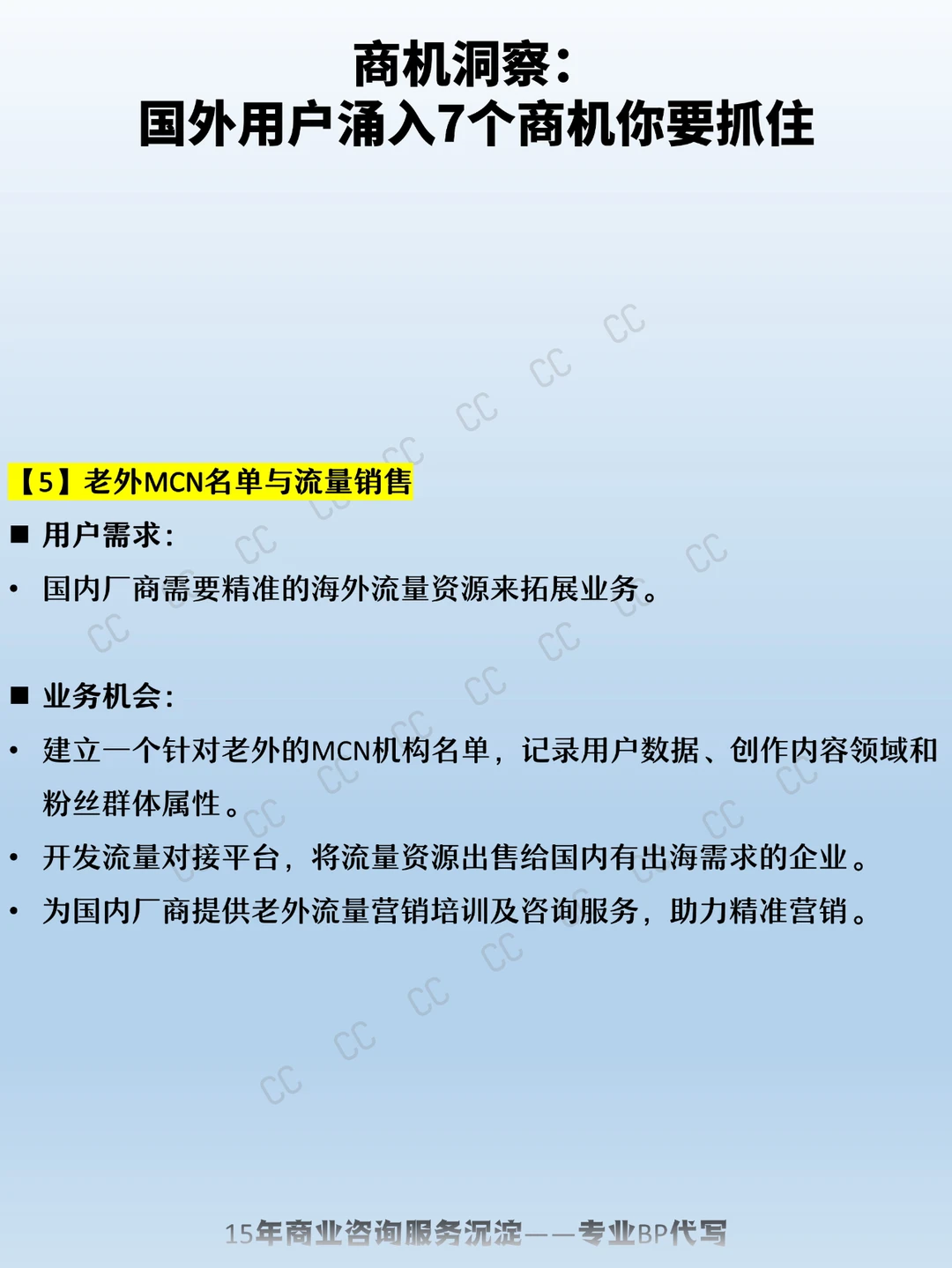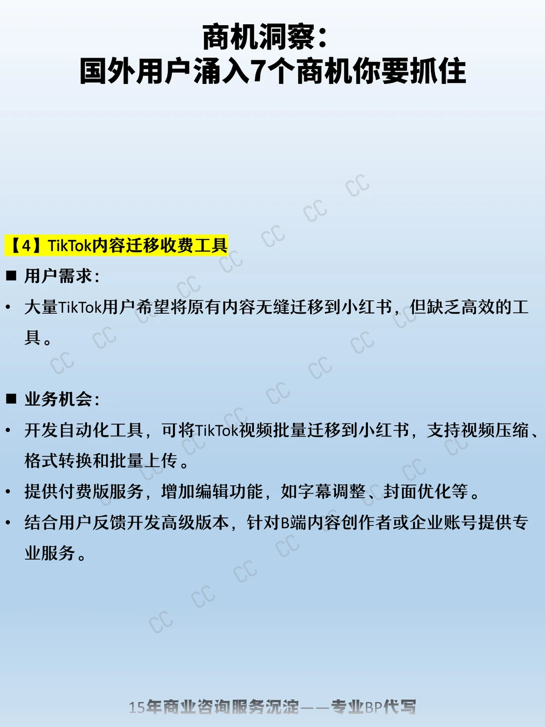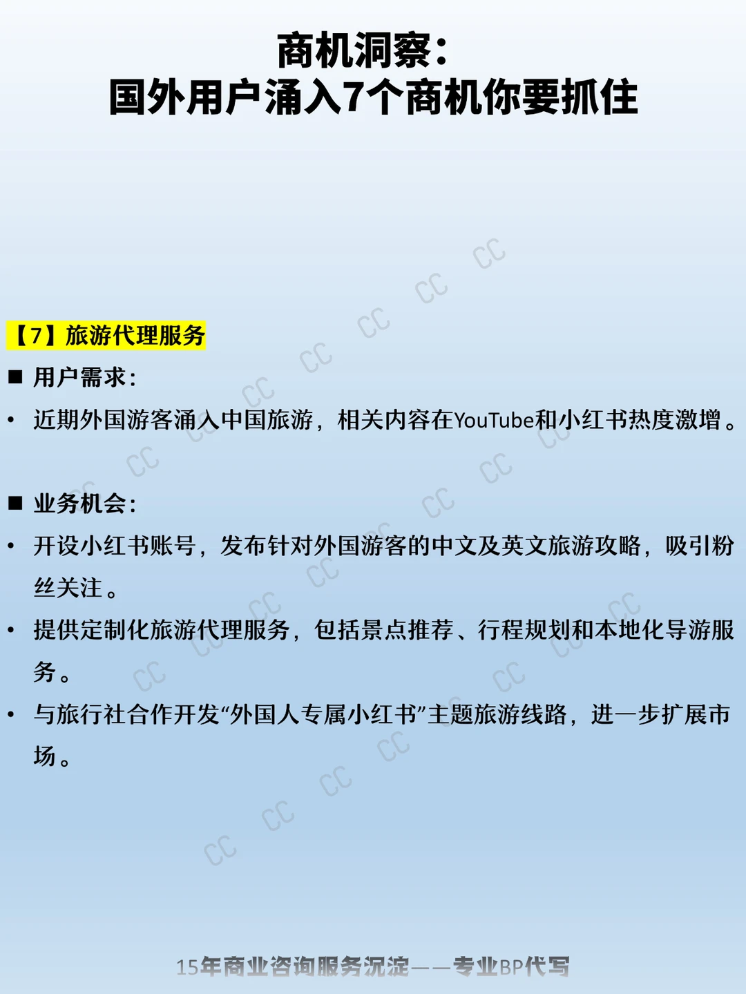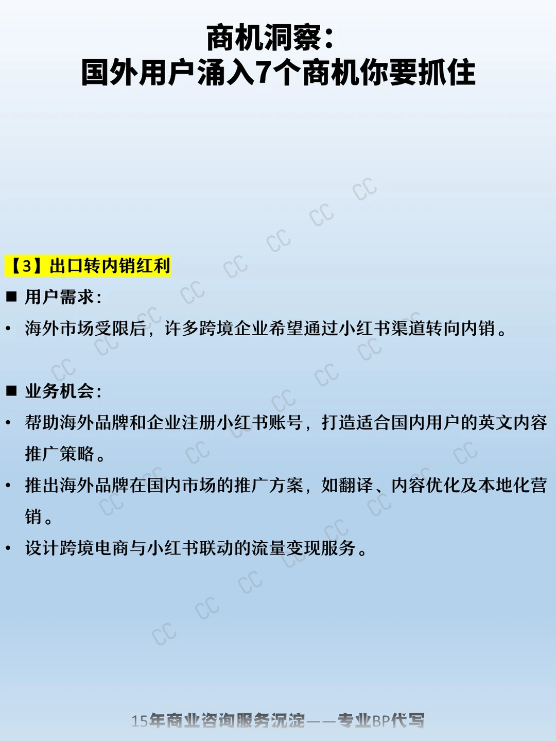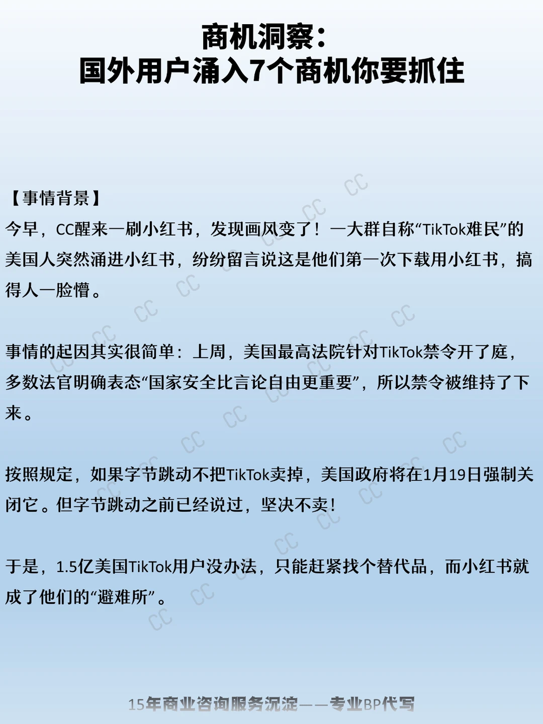 今早,CC醒来一刷,发现画风变了 不少来自海外的用户突然涌进 纷纷留言说是他们第一次使用这个平台,场面相当热闹。 以下七个业务机会你要抓住啦~ 1.关键词优化:抓住海外用户流量机遇 2.注册与运营服务:解决痛点,高效布局 3.出口转内销:抓住流量红利,拓展国内市场 4.内容迁移工具:提供高效解决方案 5.海外创作者资源库:精准对接商机 6.跨文化交流服务:搭建国际用户互动桥梁 7.旅游服务代理:借海外热潮拓展新业务 商业计划书 商业模式 融资 创业 商机