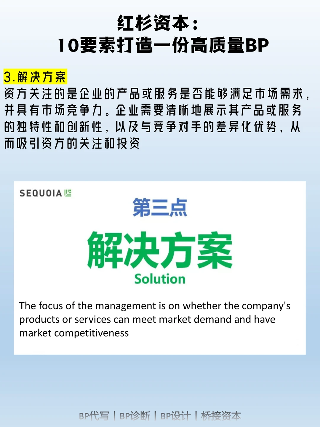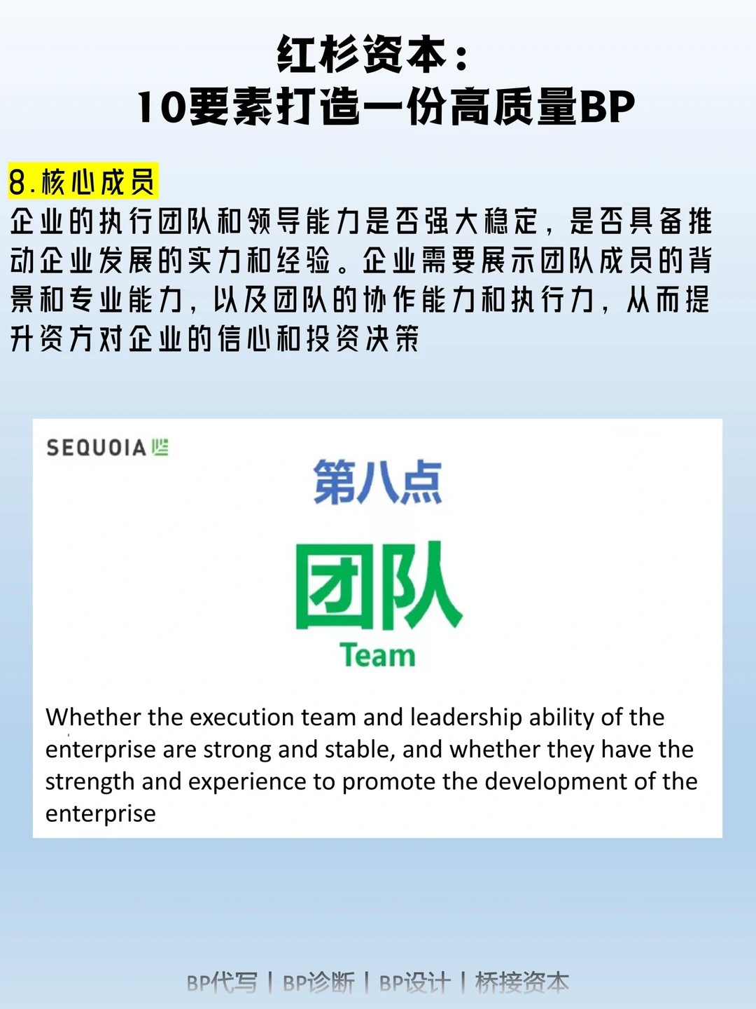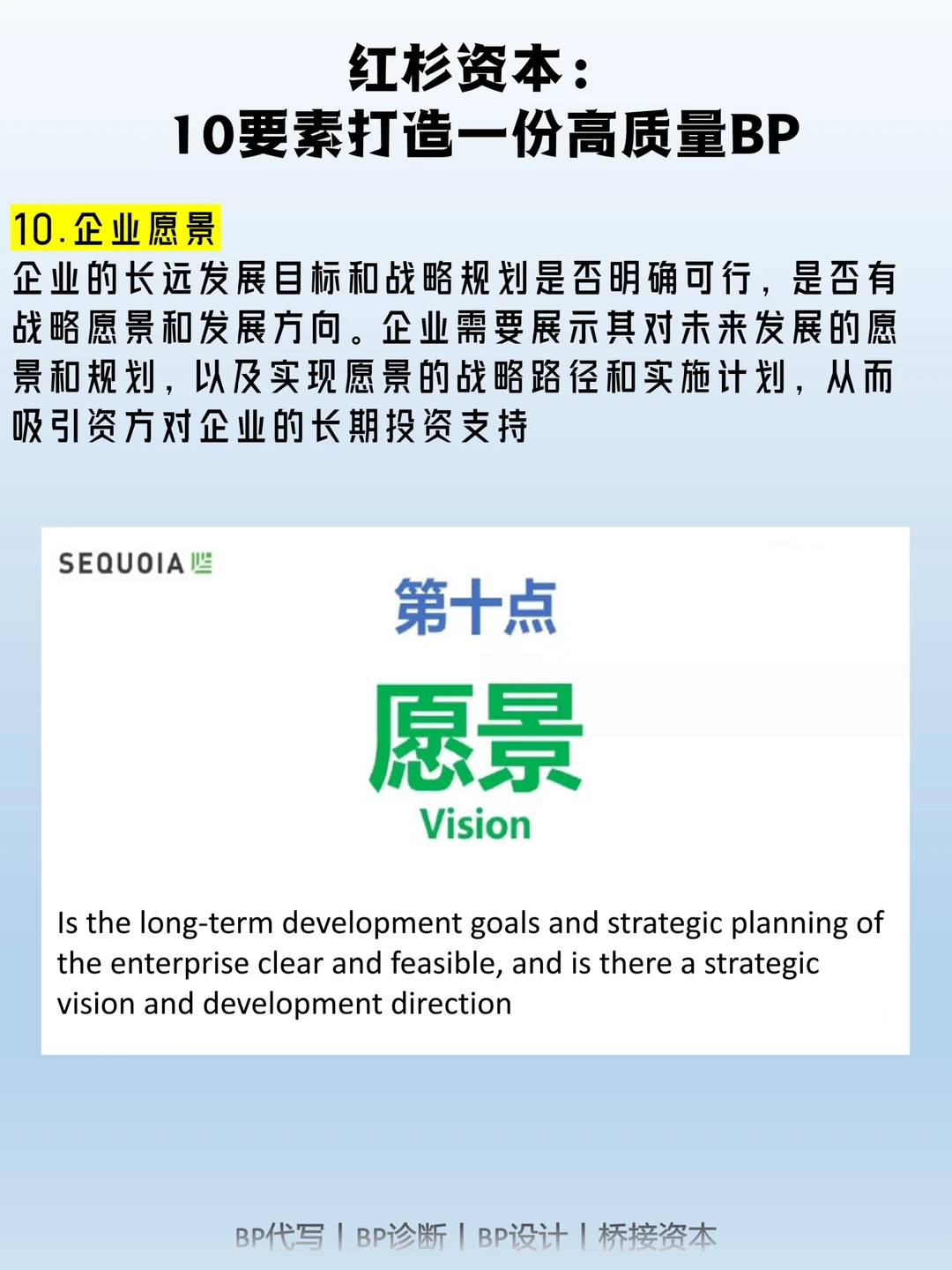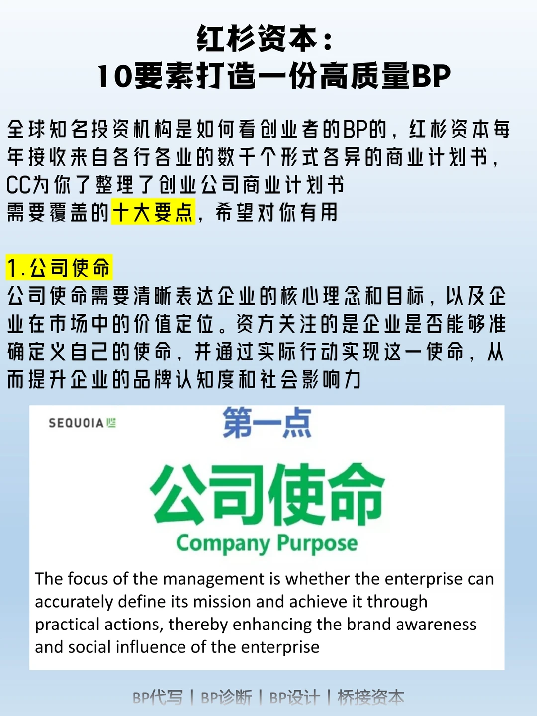 全球知名投资机构是如何看创业者的BP的,红杉资本每年接收来自各行各业的数千个形式各异的商业计划书,CC为你了整理了创业公司商业计划书 需要覆盖的十大要点,希望对你有用: 1.公司使命 2.市场痛点 3.解决方案 4.切入时机 5.市场空间 6.竞争态势 7.商业模式 8.核心团队 9.财务预算 10.企业愿景