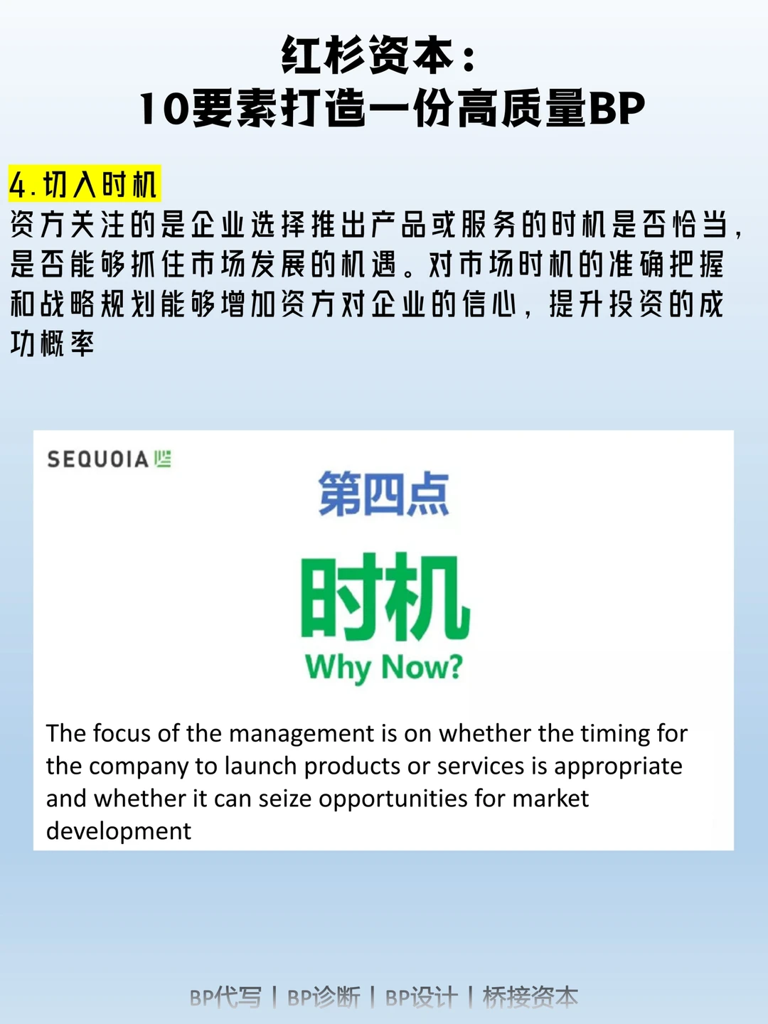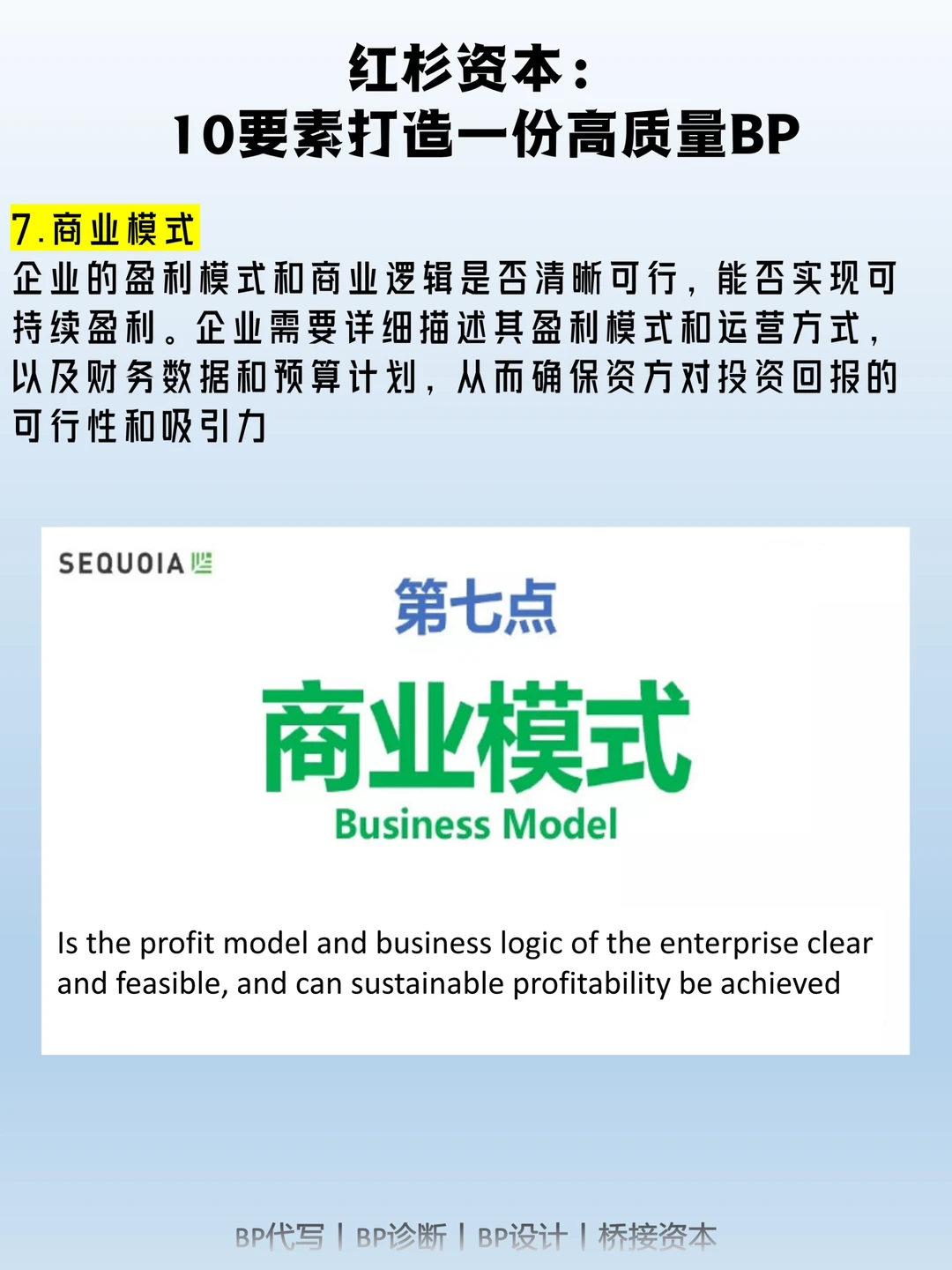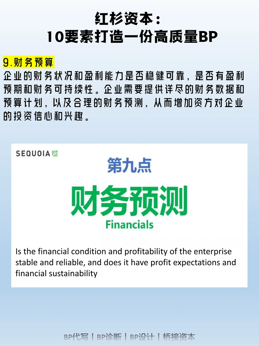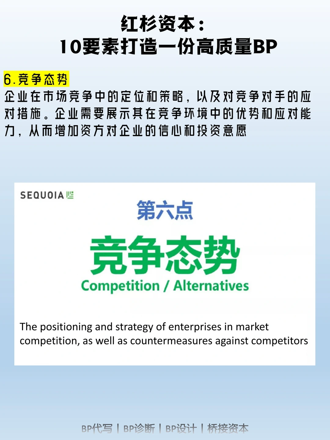全球知名投资机构是如何看创业者的BP的,红杉资本每年接收来自各行各业的数千个形式各异的商业计划书,CC为你了整理了创业公司商业计划书 需要覆盖的十大要点,希望对你有用: 1.公司使命 2.市场痛点 3.解决方案 4.切入时机 5.市场空间 6.竞争态势 7.商业模式 8.核心团队 9.财务预算 10.企业愿景