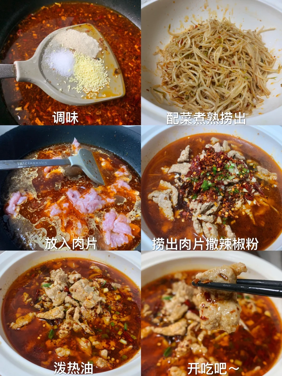 4⃣️:转小火保持微微沸腾 下肉片,全部下完后转大火煮开三四分钟就熟了。倒入碗里 撒上一把辣椒面 葱花 泼热油爆香。