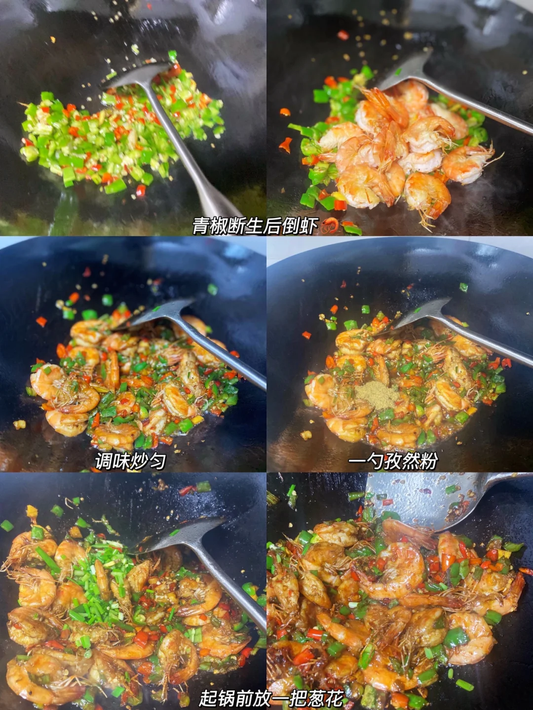 基围虾白灼吃够了 试试香辣味的吧[萌萌哒R] ✨食材:基围虾 青椒 小米椒 姜 蒜 1⃣️:虾头剥掉把虾线抽出来,再用剪刀剪开开背。小米椒跟青椒先对半切开 切成条 再切成碎碎。 2⃣️:虾用厨房纸巾擦干水份,锅里倒油(比炒菜稍微多一丢丢)油烧热后放虾炒变色 盛出备用。 3⃣️:底油炒香姜蒜小米椒 再放青椒,青椒炒断生后倒入虾,放两勺生抽 一勺蚝油 一点白糖大火炒香炒匀。再放一勺孜然粉,一点鸡粉 一把葱花大火炒匀。 好好吃饭呀🤘🏻