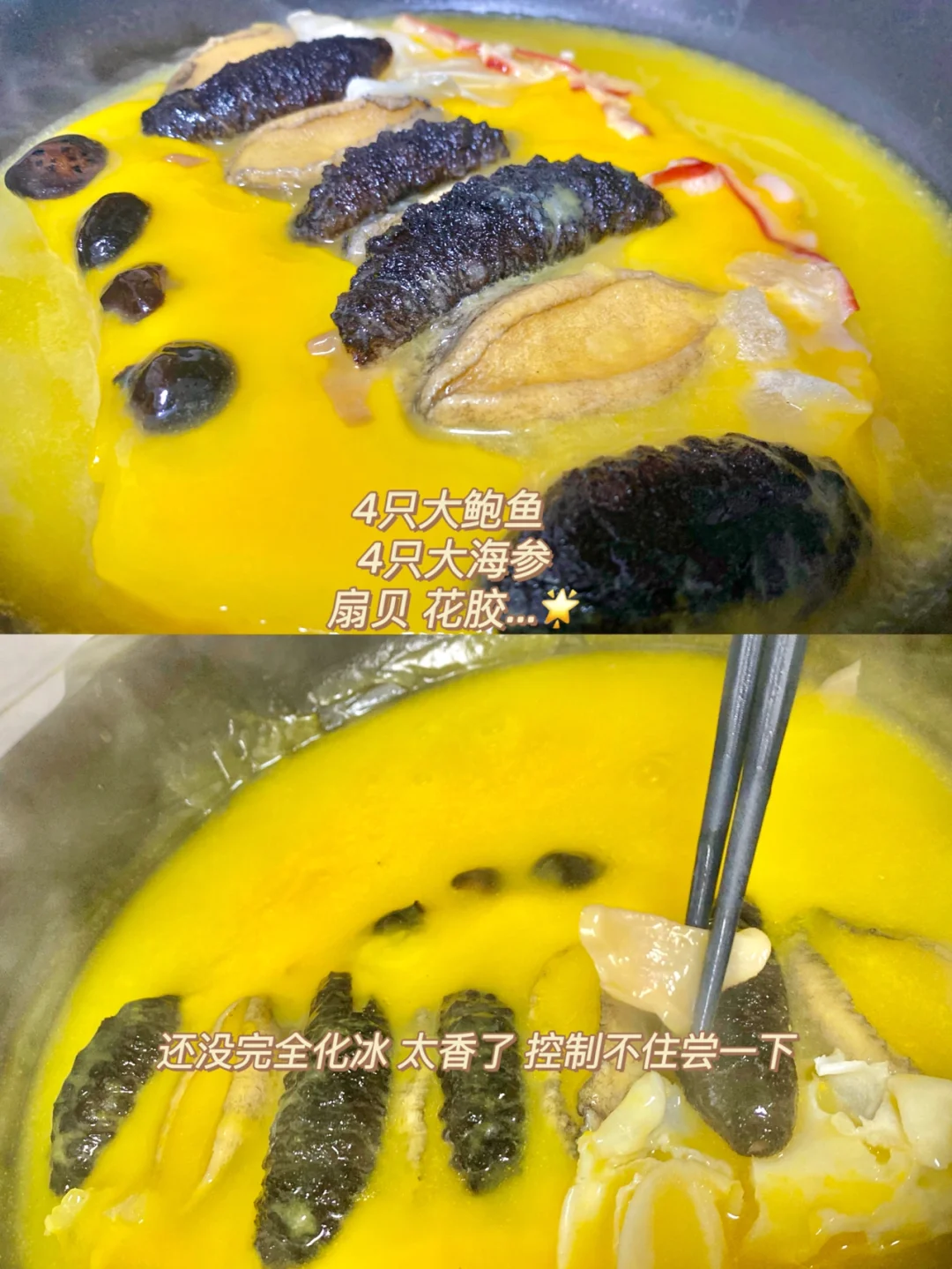 朕DE汤佛跳墙拆开包装加热就可以吃啦~ 汤真的好香醇 入口很顺滑~我崽喝了大半碗[赞R] 鲍鱼总共四大只 还有四根海参 花胶 扇贝肉 裙边.. 年夜饭我也要加入它哈哈哈哈 太方便了[偷笑R]