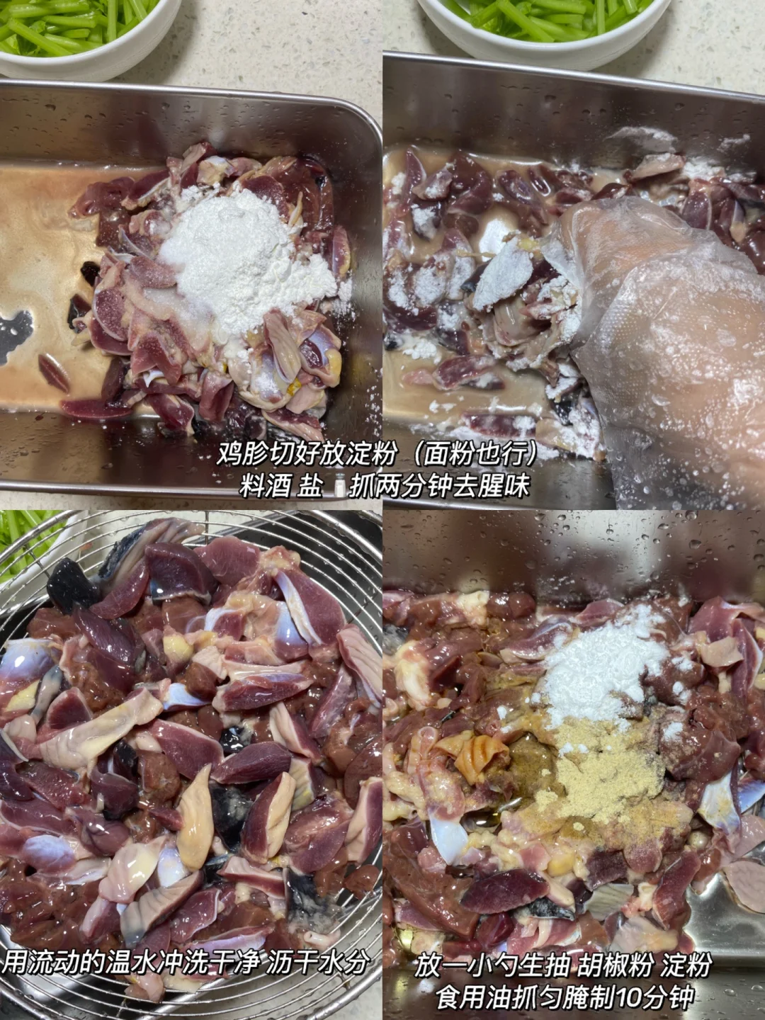 1⃣️:鸡杂买回来用温水多洗几遍,清理干净上面的油脂再切片(我这里是七个鸡胗 两个肝)切好后放碗里 放三勺淀粉 料酒 一小勺盐抓两分钟,再用流动的水冲洗干净沥干水分。