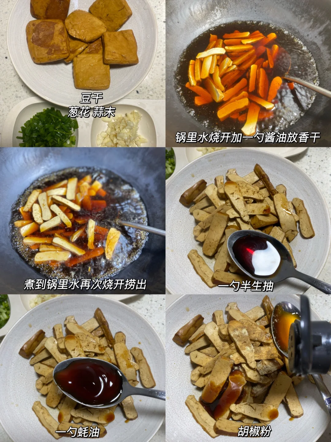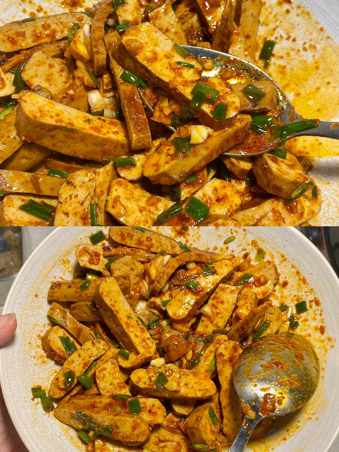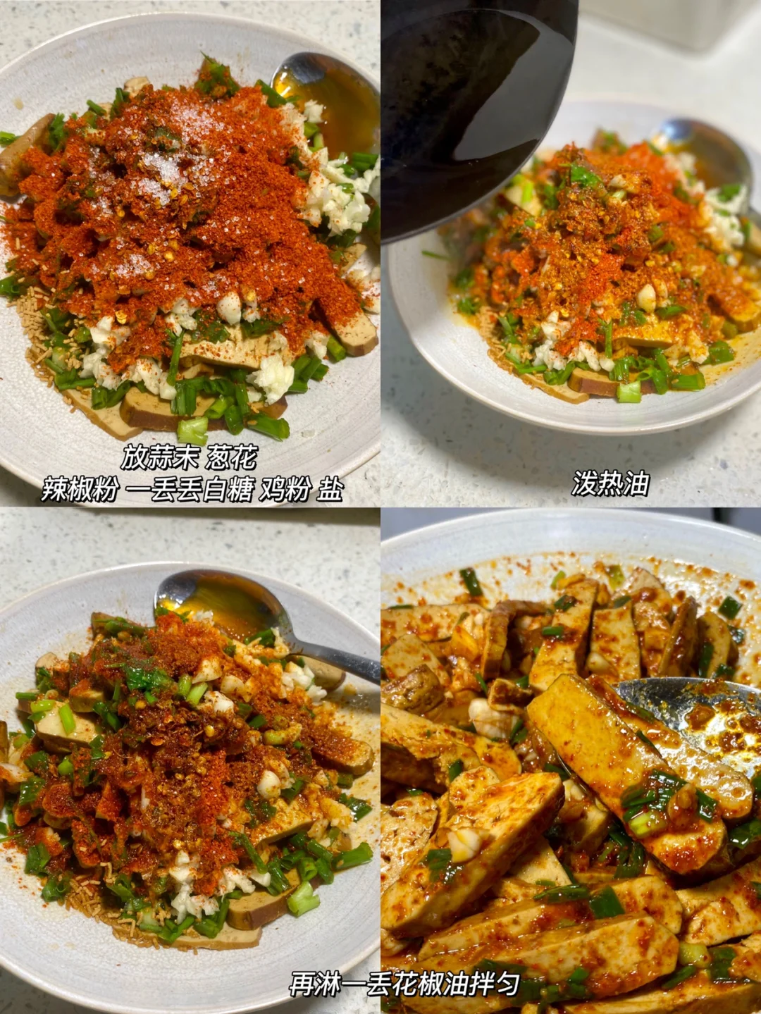 吃腻了炒香干 试试凉拌吧[偷笑R] ✨食材:香干 蒜末 葱花 辣椒粉 1⃣️:豆干洗净切均匀的片,葱 蒜切碎备用。 2⃣️:锅里水烧开加一勺酱油 放入香干,煮到水再次烧开把豆干捞出来放碗里。放一勺半生抽/一勺蚝油/胡椒粉 蒜末/葱花/辣椒粉 /一丢丢白糖/鸡粉 泼热油激发香味。 3⃣️:再淋一点花椒油增香丰富口感。拌匀就可以开吃啦 麻辣口的 快手又下饭[色色R] 好好吃饭呀🤘🏻