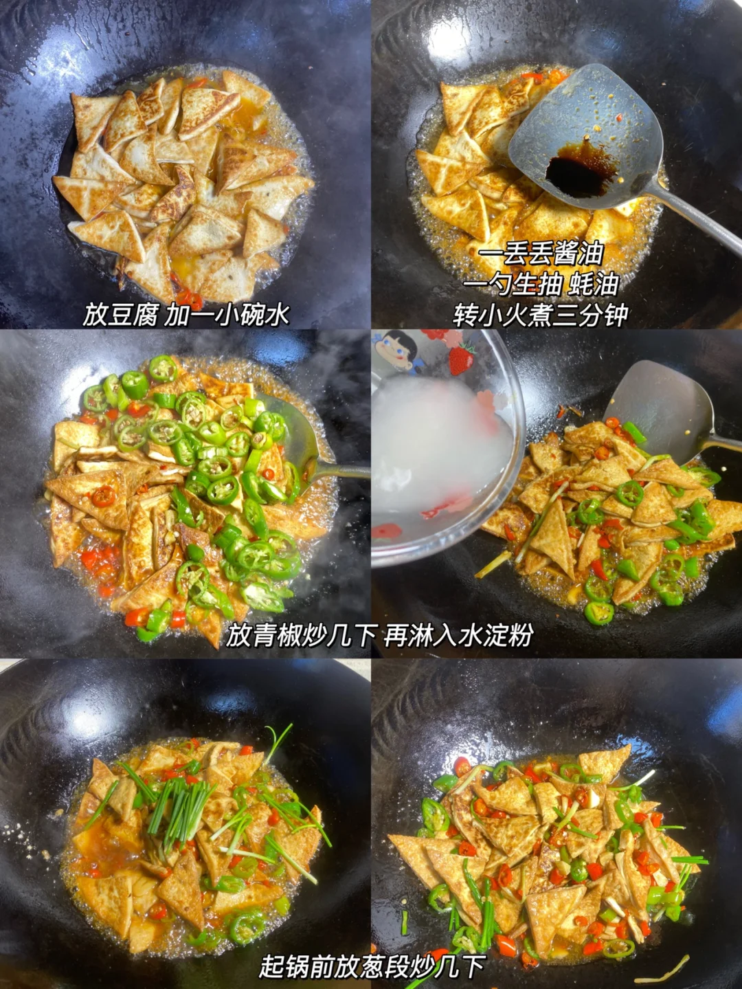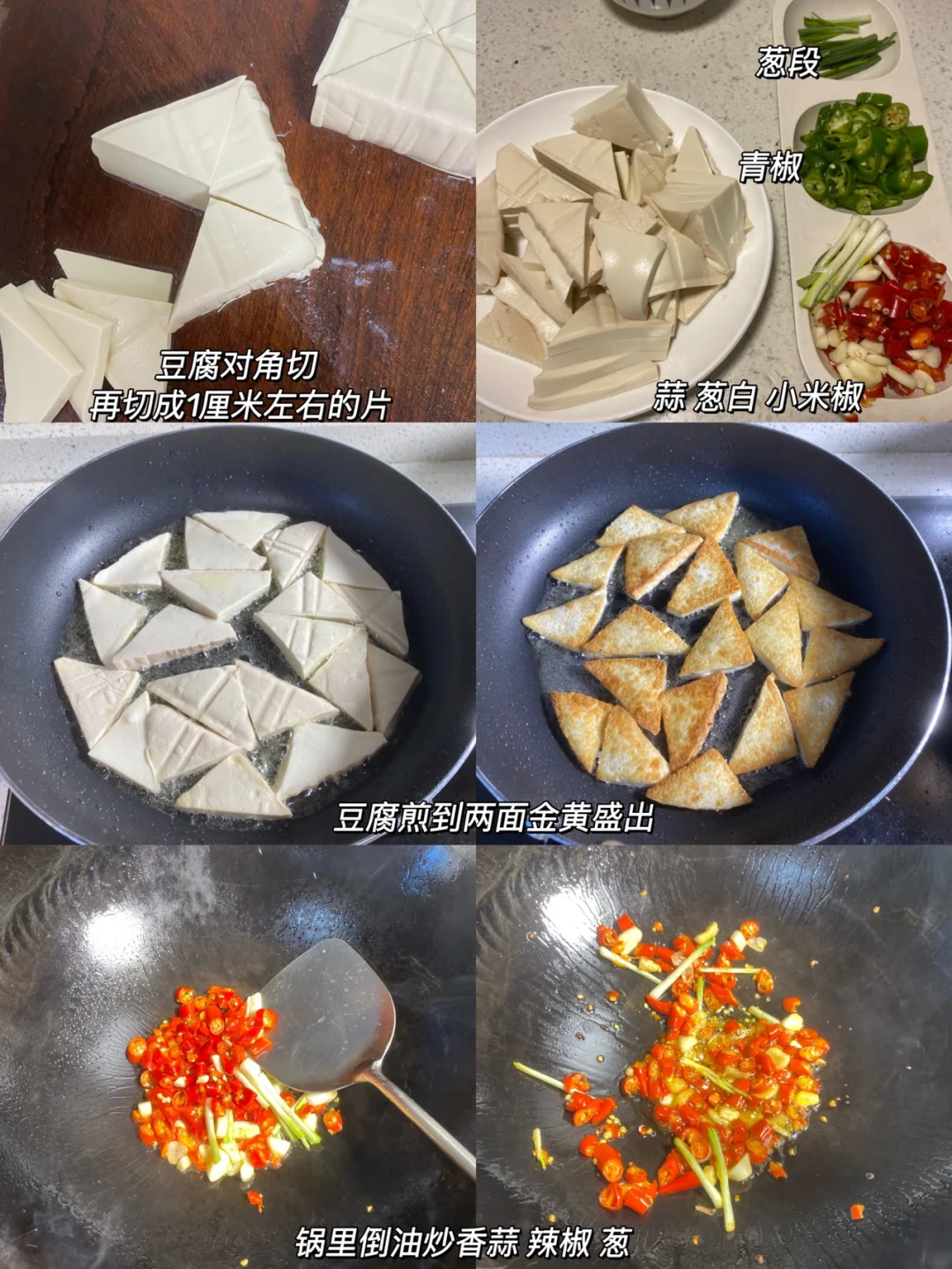 又嫩又入味😋从小吃到大的豆腐做法[赞R] ✨食材:三块嫩豆腐 蒜 葱 小米椒 青椒 1⃣️:食材全部切好备用。不粘锅里倒油 放豆腐煎到一面金黄再翻面煎,两面都煎好后盛出来。 2⃣️:锅里倒油放 葱白 蒜 小米椒炒出辣味 放豆腐,加一小碗水。放一丢酱油/一勺生抽 蚝油转小火煮三分钟。 放入青椒圈炒几下,淋入水淀粉 放一点盐 鸡粉再煮一分钟。起锅前放葱段炒两下。 煮豆腐的时候可以多煮一会 更入味。 好好吃饭呀🤘🏻