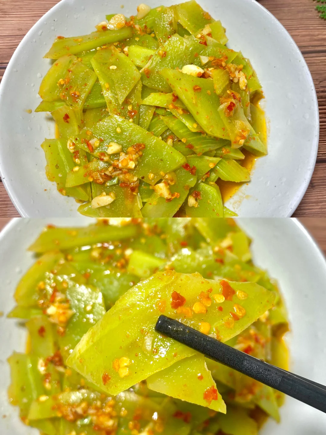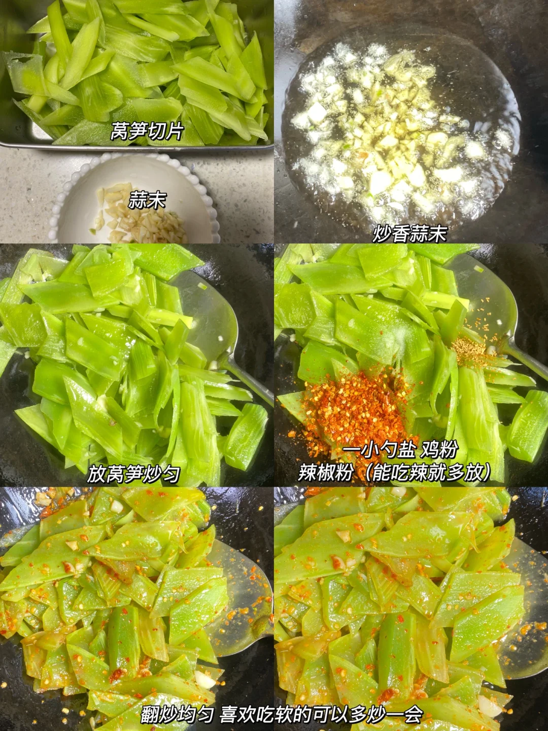 ✨食材:莴笋 蒜末 辣椒粉 1⃣️:莴笋去皮斜刀切段,再切成片。蒜末切碎 多一些 2⃣️:锅里倒油放蒜末炒香 下莴笋片翻炒几下,一小勺盐 鸡精 三勺辣椒粉(根据自己口味加)大火翻炒均匀。尝尝味道不够就加点盐🧂 我喜欢吃脆脆的 炒匀后就盛出来了。 喜欢吃软一点的多炒一会 好好吃饭呀🤘🏻