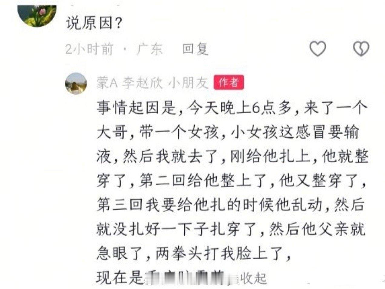 12月1日,河北一名女护士发文称:因小孩感冒输液乱动没扎好扎穿了,被小孩父亲连打两拳,导致重症脑震荡、太阳穴骨裂、耳膜出血、下巴脱臼,她说已报警。