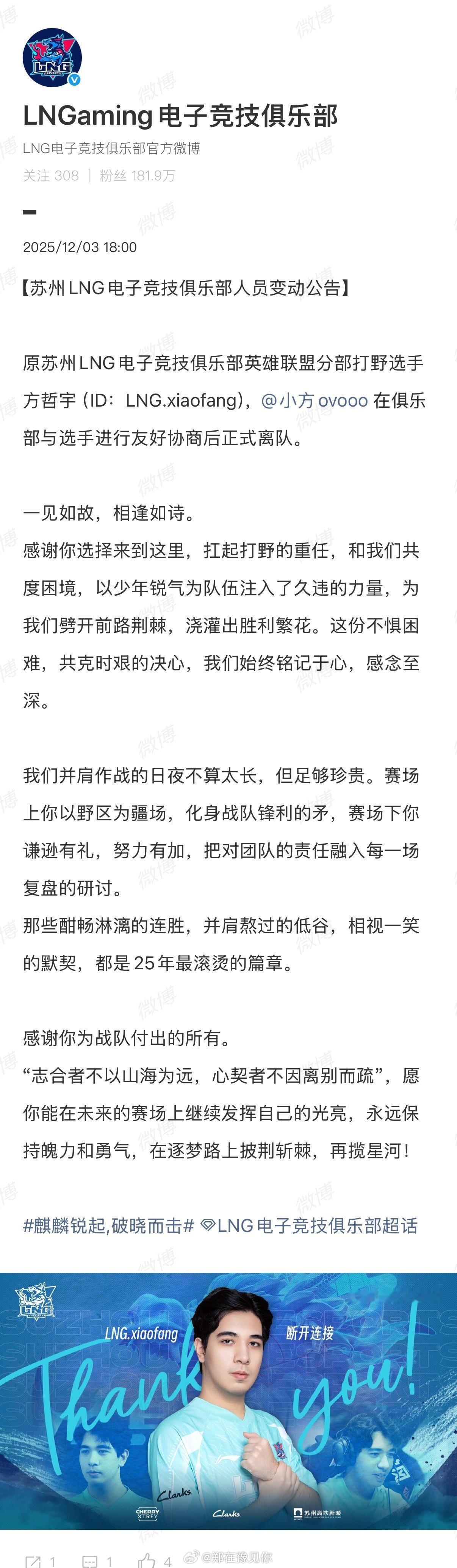 lng官宣xiaofang离队 【苏州LNG电子竞技俱乐部人员变动公告】原苏州LNG电子竞技俱乐部英雄联盟分部打野选手方哲宇(ID:LNG.xiaofang)在俱乐部与选手进行友好协商后正式离队。acg优创官全网热点共创计划英雄联盟