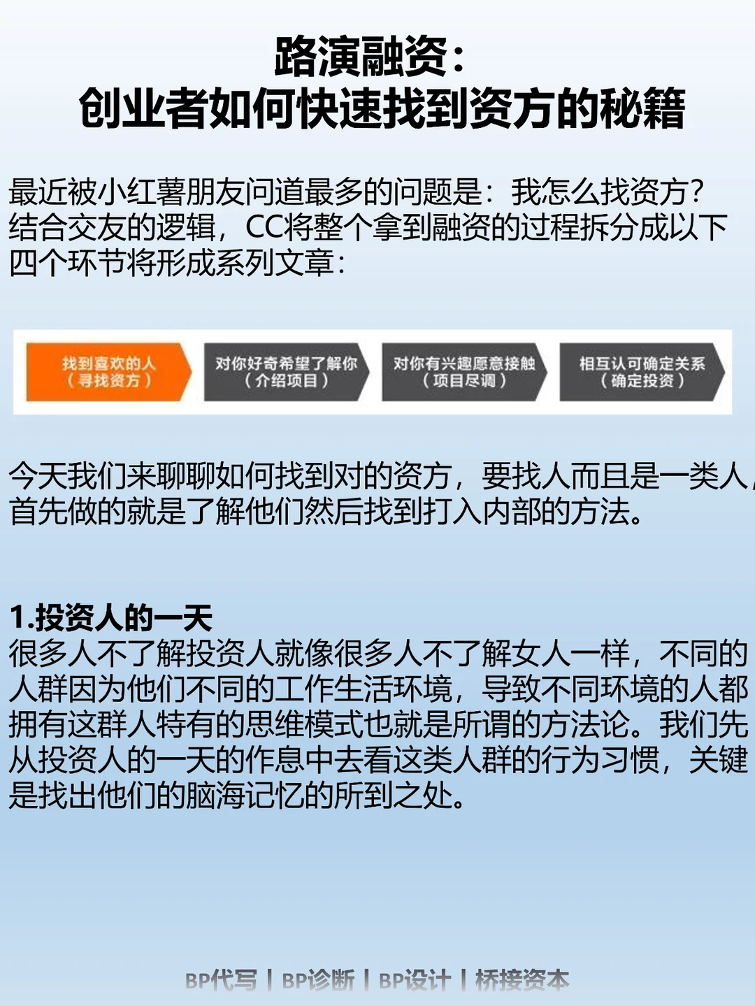 最近被小红薯朋友问道最多的问题是:我怎么找资方? 结合交友的逻辑,CC将整个拿到融资的过程拆分成以下四个环节将形成系列文章: 1.投资人的一天 2.找到投资人 3.遇到对的投资人 4.关键环节:介绍项目——项目尽调——确定投资