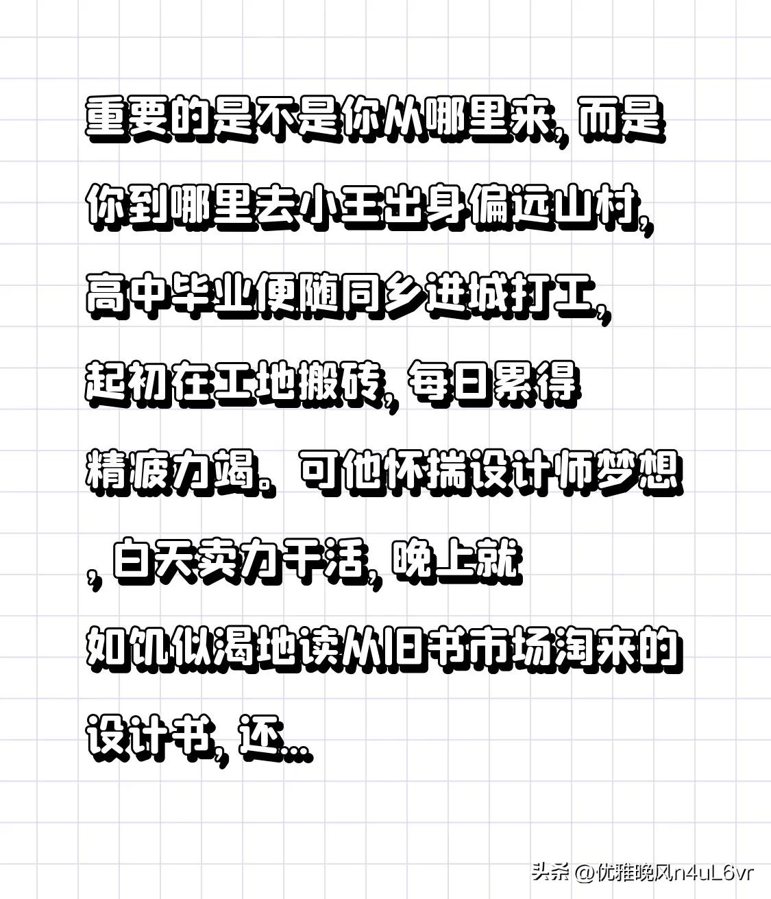重要的是不是你从哪里来,而是你到哪里去小王出身偏远山村,高中毕业便随同乡进城打工,起初在工地搬砖,每日累得精疲力竭。可他怀揣设计师梦想,白天卖力干活,晚上就如饥似渴地读从旧书市场淘来的设计书,还在手机上学习免费课程。面对他人“癞蛤蟆想吃天鹅肉”的嘲笑,他默默攒钱报班。三年后,他凭借扎实功底与独特创意,成功入职设计公司,实现从工地到办公室的跨越。