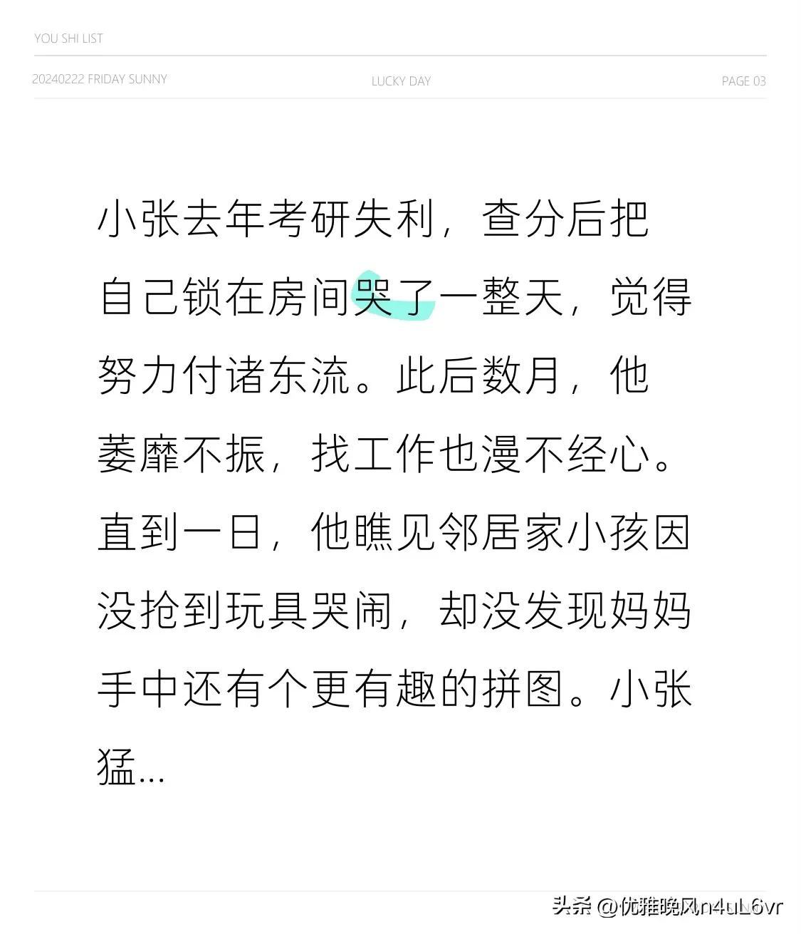 小张去年考研失利,查分后把自己锁在房间哭了一整天,觉得努力付诸东流。此后数月,他萎靡不振,找工作也漫不经心。直到一日,他瞧见邻居家小孩因没抢到玩具哭闹,却没发现妈妈手中还有个更有趣的拼图。小张猛然醒悟,自己何尝不是如此?随后他重振精神,精心修改简历、积极准备面试,最终斩获一家心仪企业的offer。