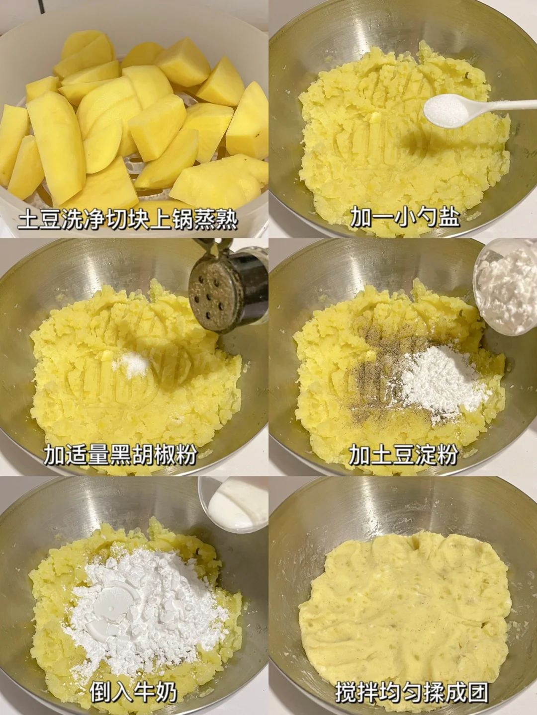 2⃣️土豆泥+1小勺盐+黑胡椒粉适量+土豆淀粉+牛奶,全部搅拌均匀揉成团。