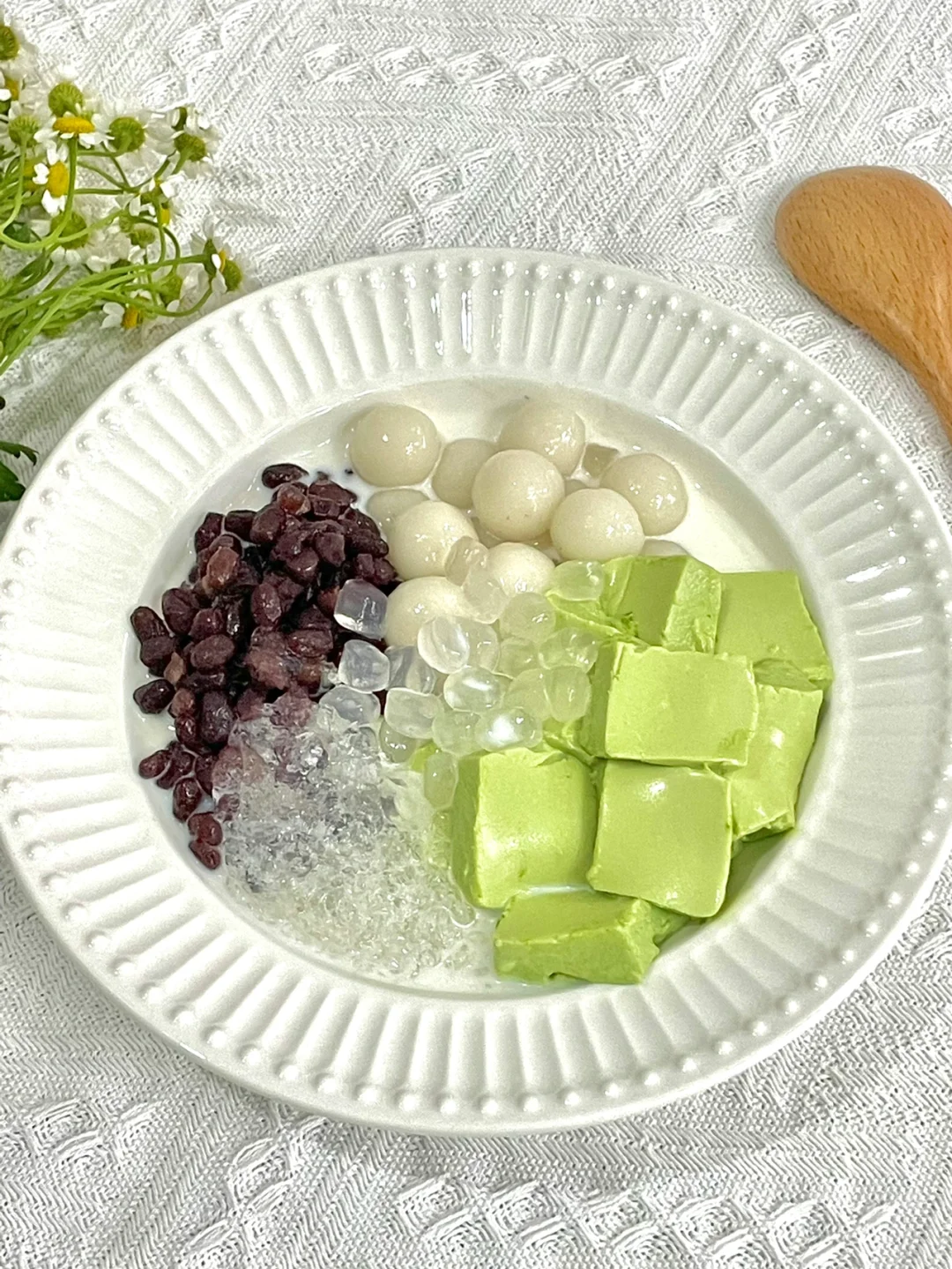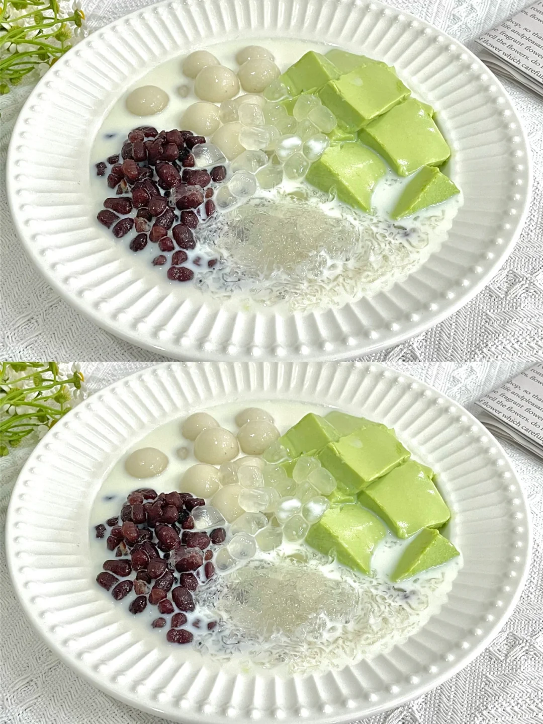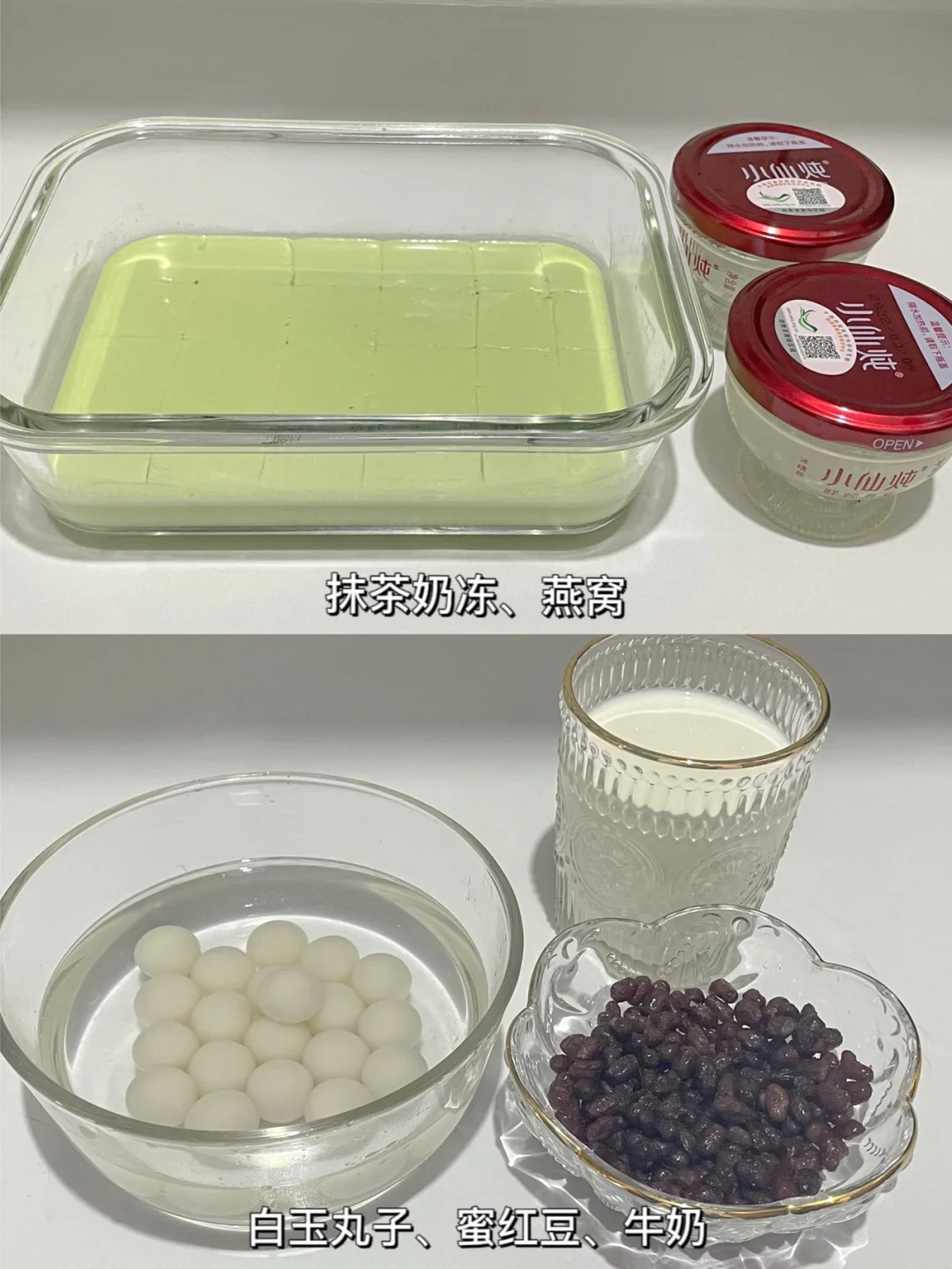 3⃣️组装环节:抹茶奶冻➕白玉丸子➕蜜红豆➕寒天,倒入适量牛奶,再放上燕窝简直太滋补养颜啦。
