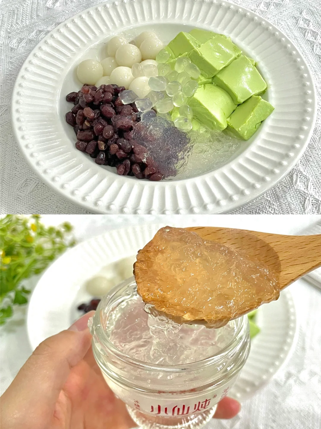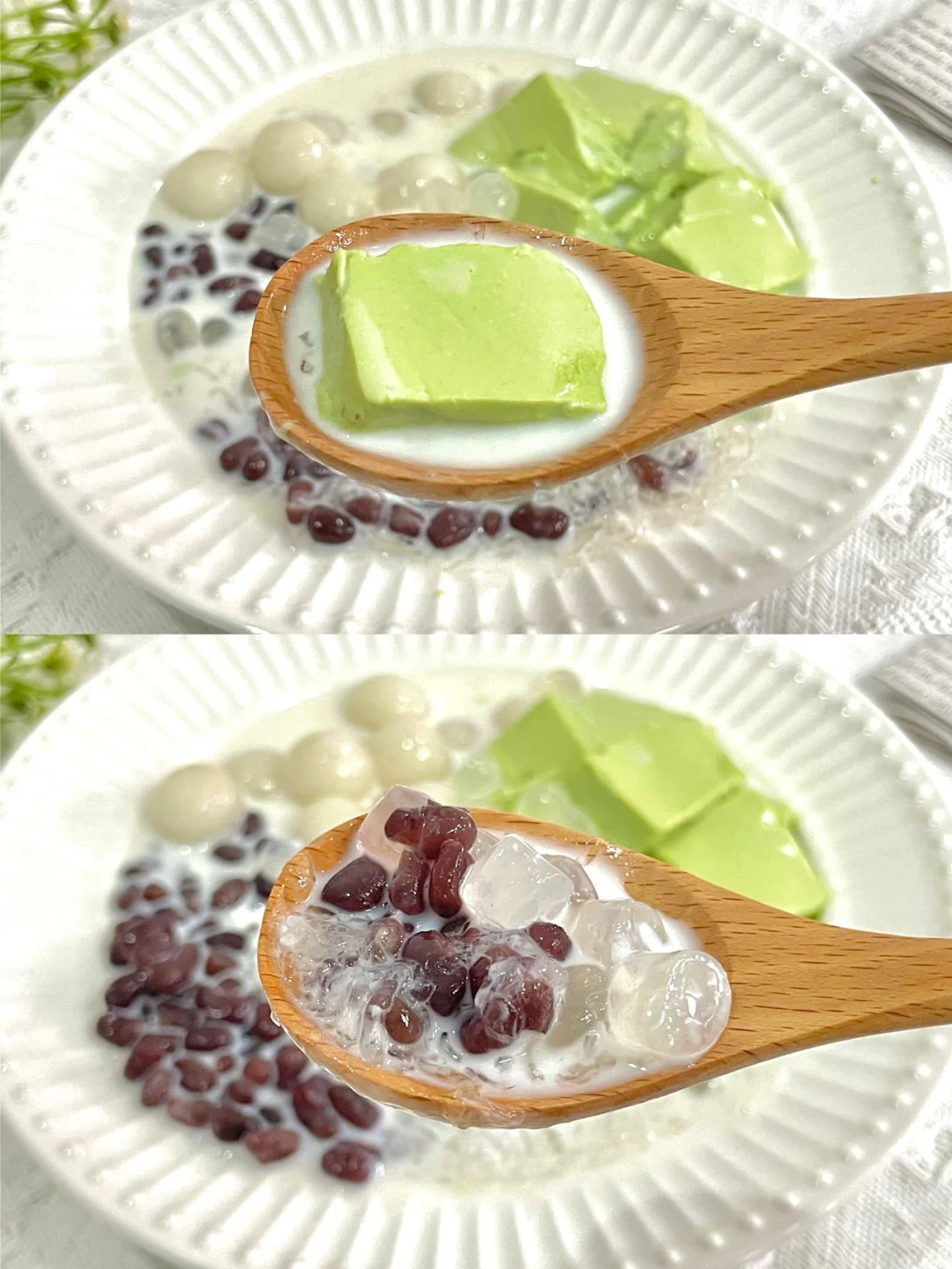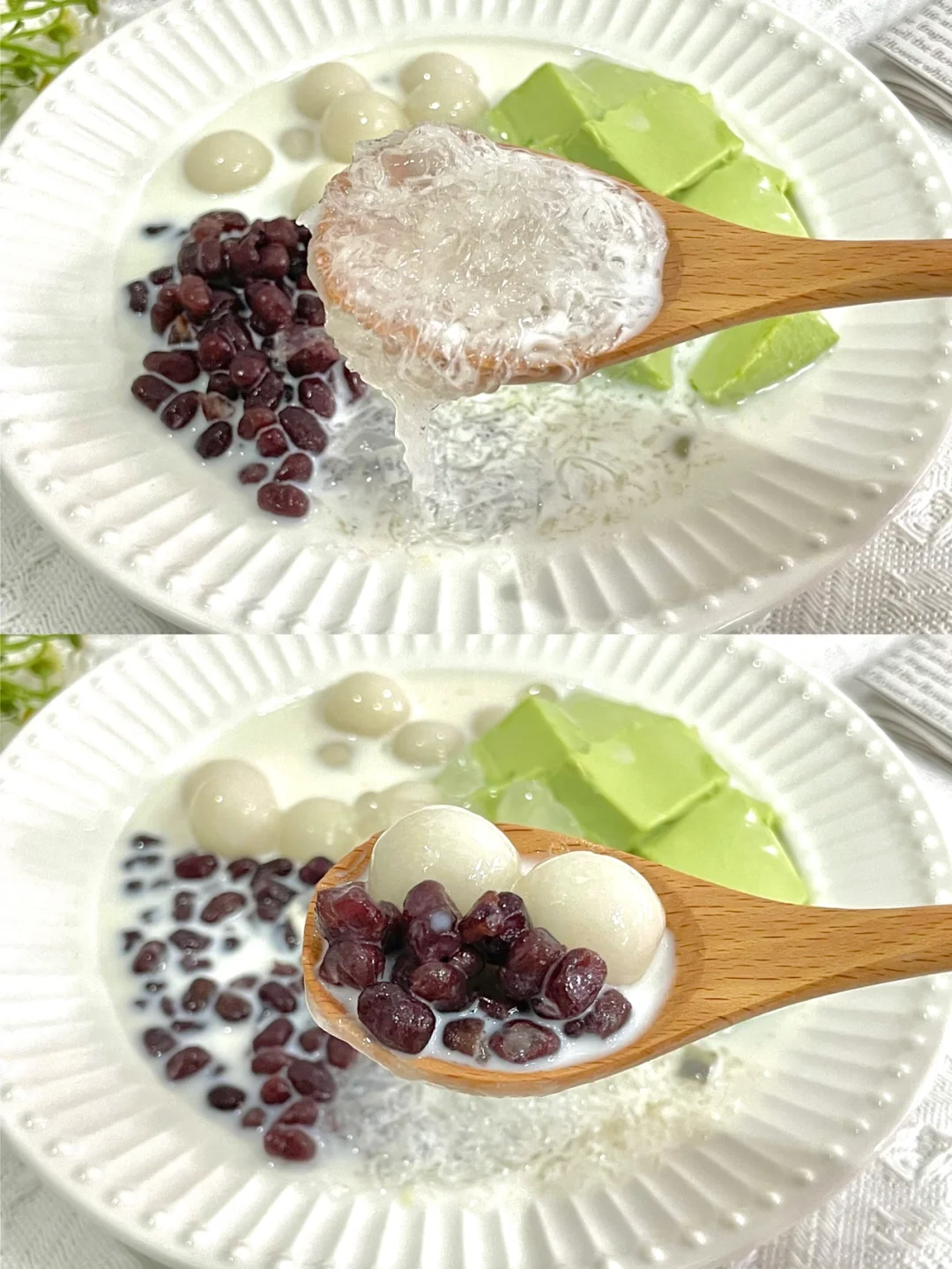 3⃣️组装环节:抹茶奶冻➕白玉丸子➕蜜红豆➕寒天,倒入适量牛奶,再放上燕窝简直太滋补养颜啦。