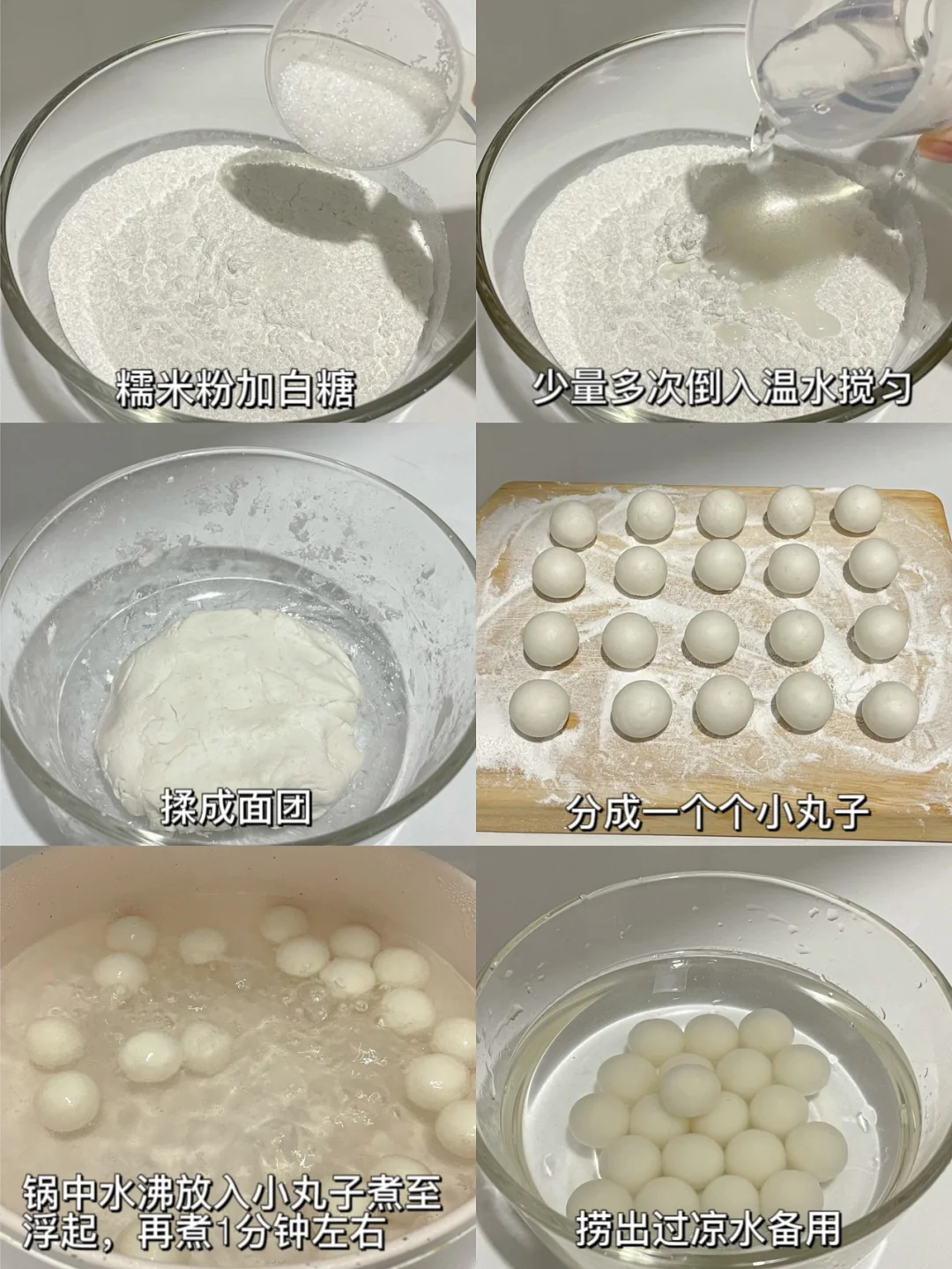 2⃣️糯米粉中加白糖搅匀,再少量多次倒入温水搅拌均匀揉成面团,分成一个个的小丸子;锅中水沸放入小丸子煮至浮起,再煮1分钟左右捞出过凉水。