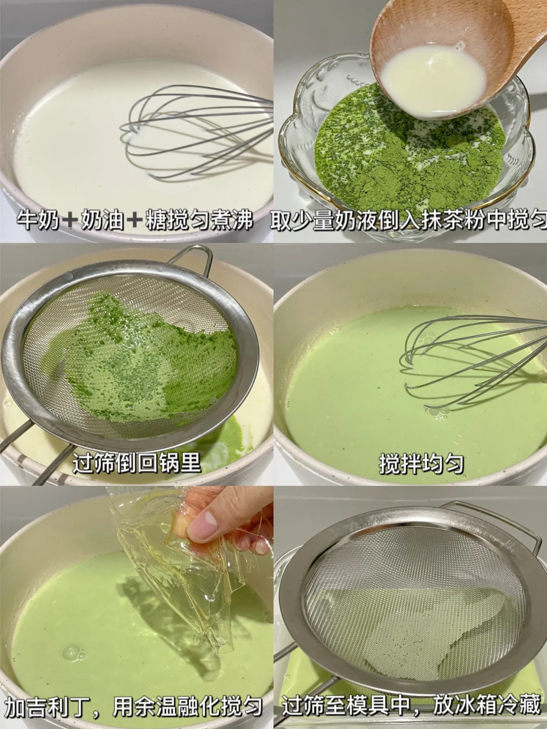 1⃣️牛奶+奶油+糖倒入锅中搅匀并煮沸关火,取少量奶液倒入抹茶粉中搅匀;将抹茶液过筛倒回锅中搅匀,加入已泡软的吉利丁片,用余温融化搅拌均匀;将抹茶液过筛至模具中,放冰箱冷藏2个小时以上。