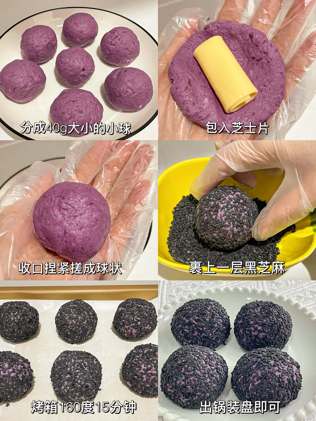 2⃣️把面团分成40g大小的小球,包入芝士片,收口捏紧搓成球状,再裹上一层黑芝麻。