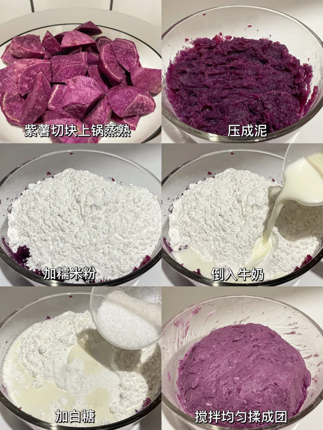 1⃣️紫薯切块上锅蒸熟压成泥,倒入糯米粉+牛奶+白糖,搅拌均匀揉成面团。