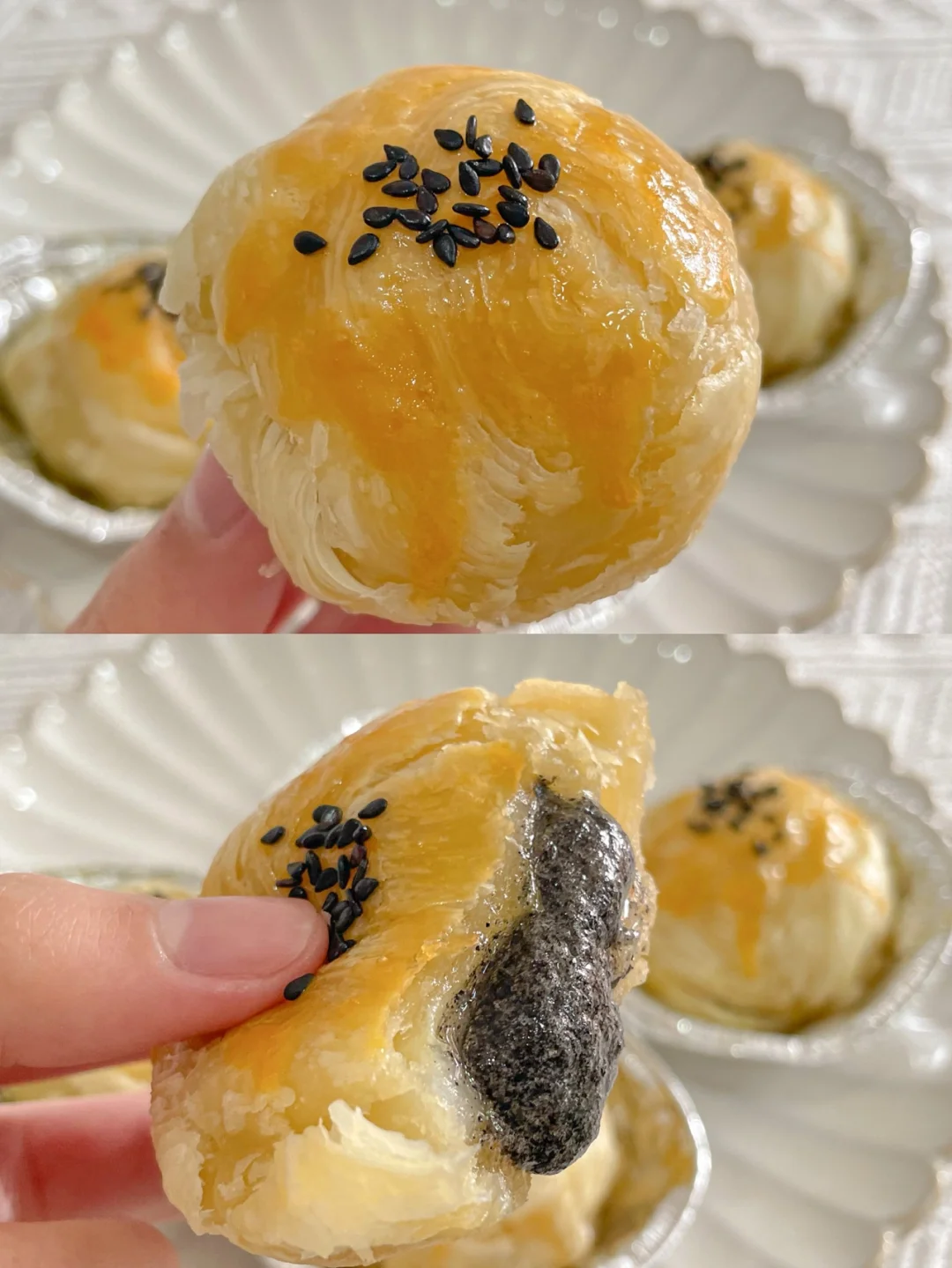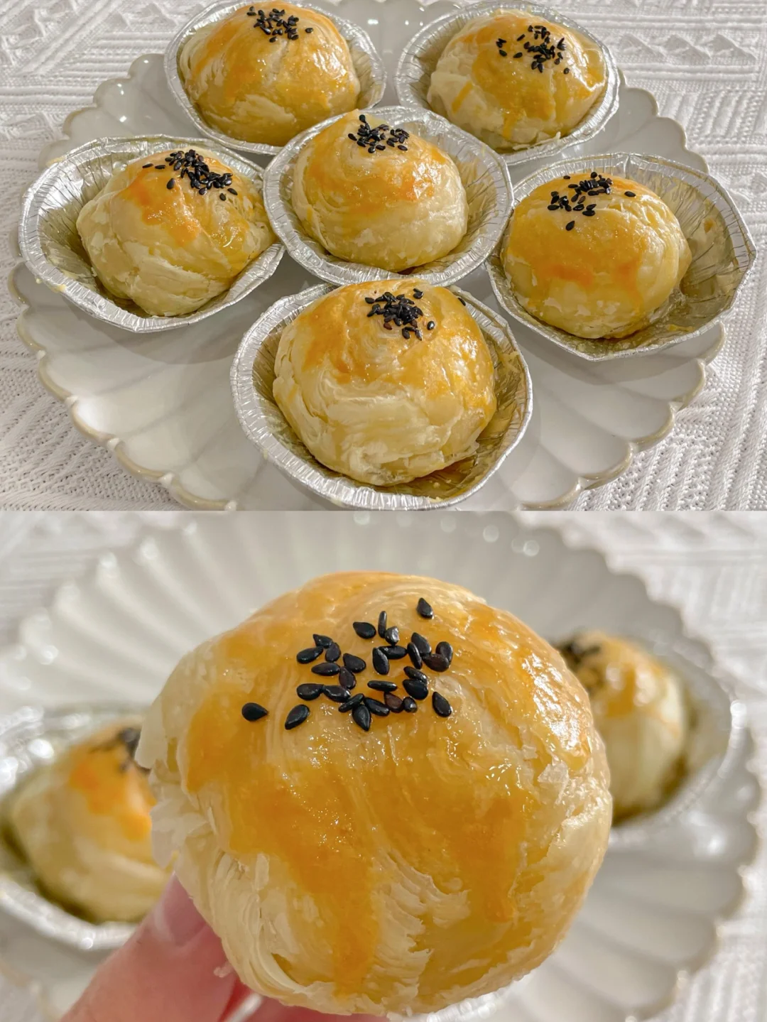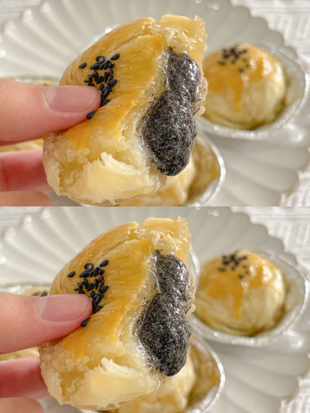 蛋挞皮的酥脆包裹着糯叽叽的黑芝麻汤圆和奶香的芝士碎,太绝了[赞R][赞R] 咬一口还会爆浆的汤圆酥,香甜软糯,巨巨巨好吃[色色R][色色R] 做法超简单,新手小包也🉑️轻松搞定,喜欢的赶紧试试呀~ 🌈食材: -蛋挞皮6个 -黑芝麻汤圆6个 -芝士碎适量 -黑芝麻适量 -蛋黄1个 🌈做法: 1⃣️蛋挞皮常温软化几分钟,撕掉蛋挞皮上的锡纸 2⃣️放入芝士碎和汤圆,包起来,捏紧捏成小团团收口朝下 3⃣️放回锡纸盒中,刷上蛋黄液,撒上黑芝麻 4⃣️放入预热好的烤箱180度15分钟左右